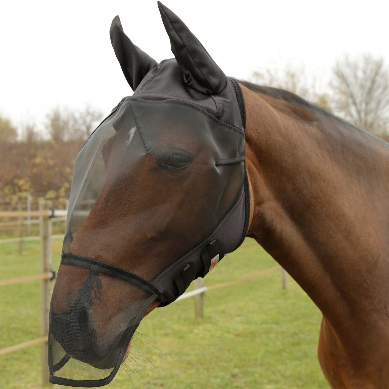 La zona delle orecchie e del naso è realizzata in un tessuto elastico e piacevolmente morbido e ha all'interno un'imbottitura in pile per evitare sfregamenti. Facile da fissare alla testa del cavallo con chiusure in velcro.