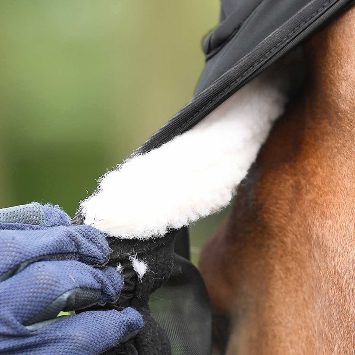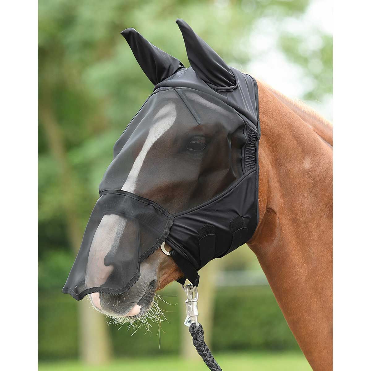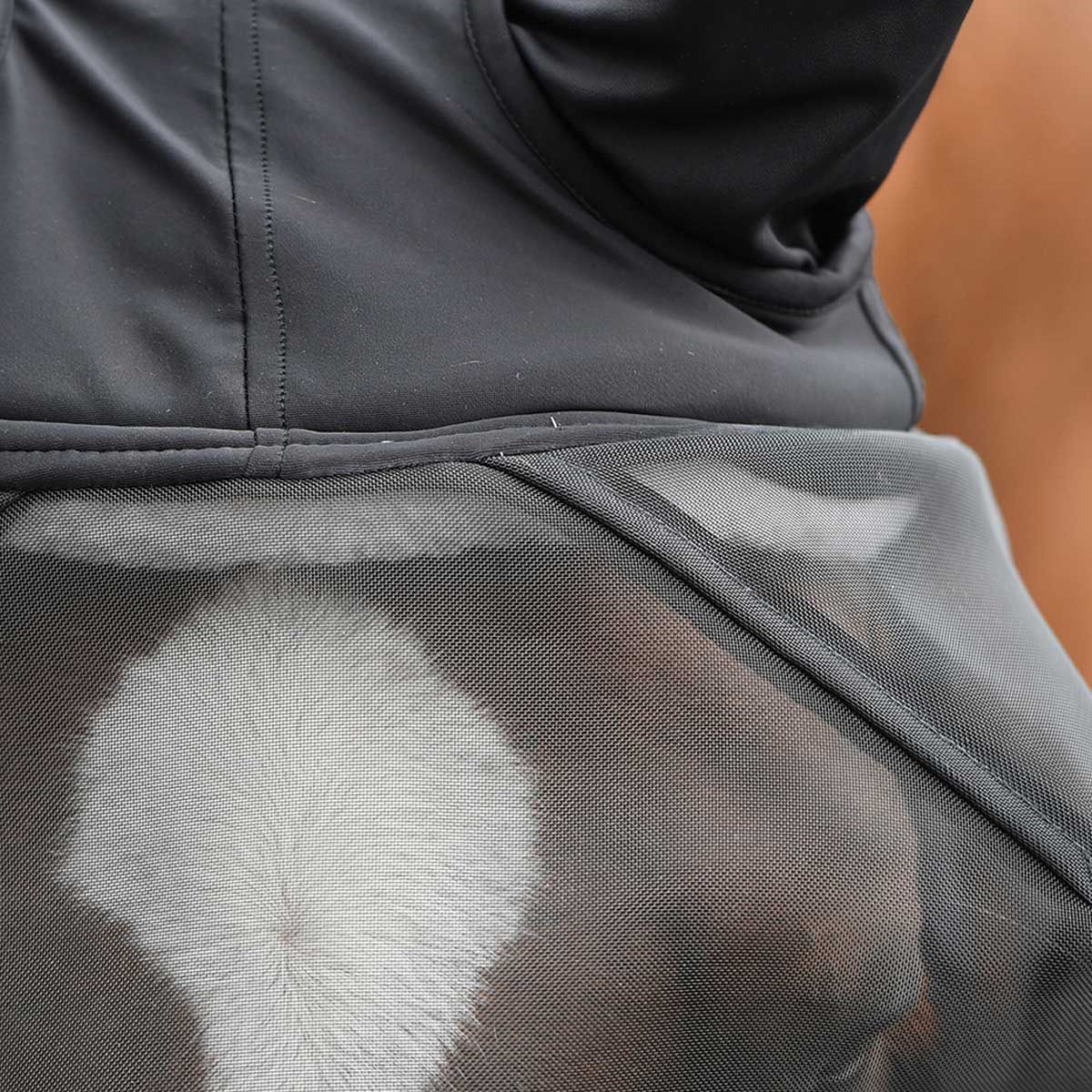- protezione per gli occhi generosamente incorporata in tessuto a rete a maglie strette con ampio spazio intorno agli occhi