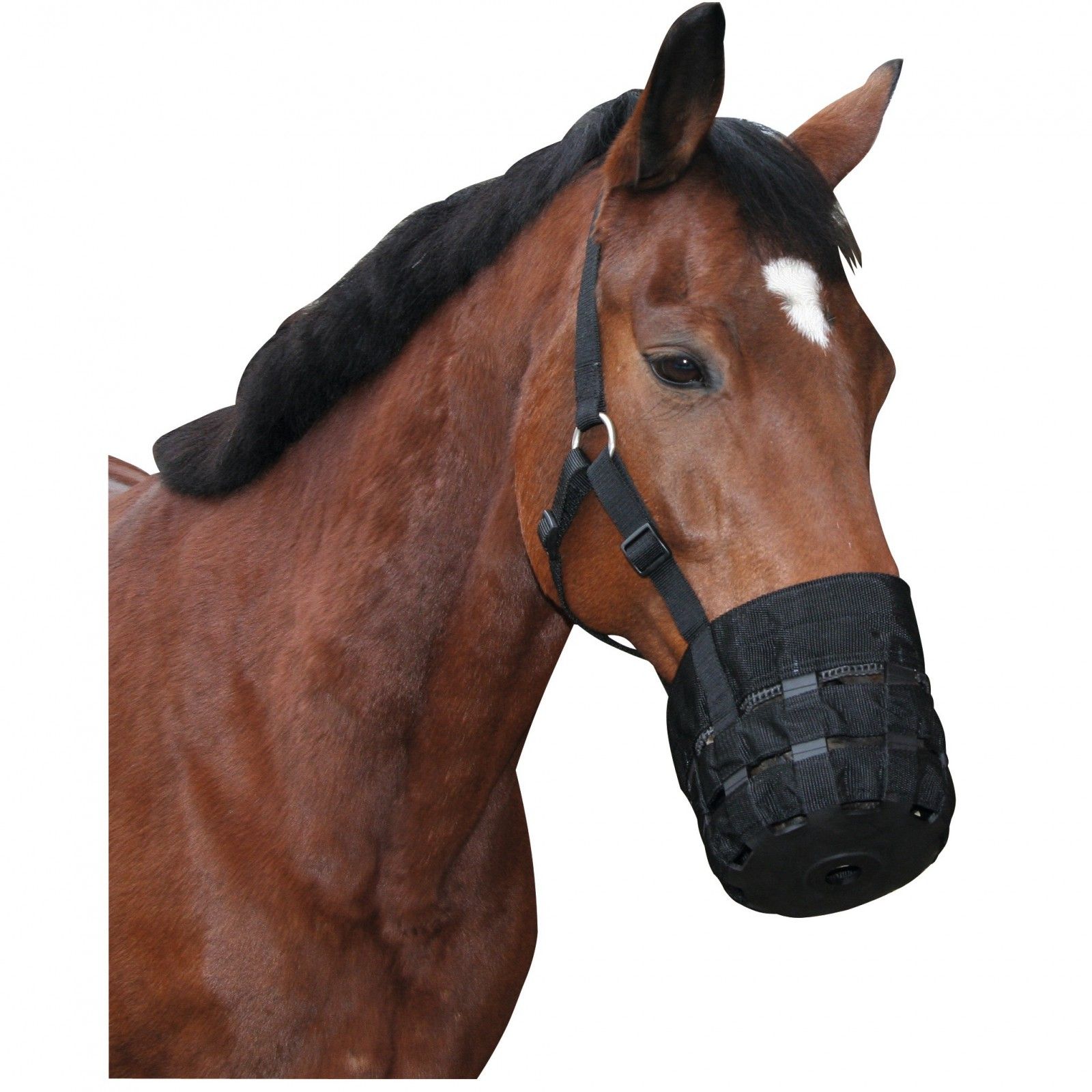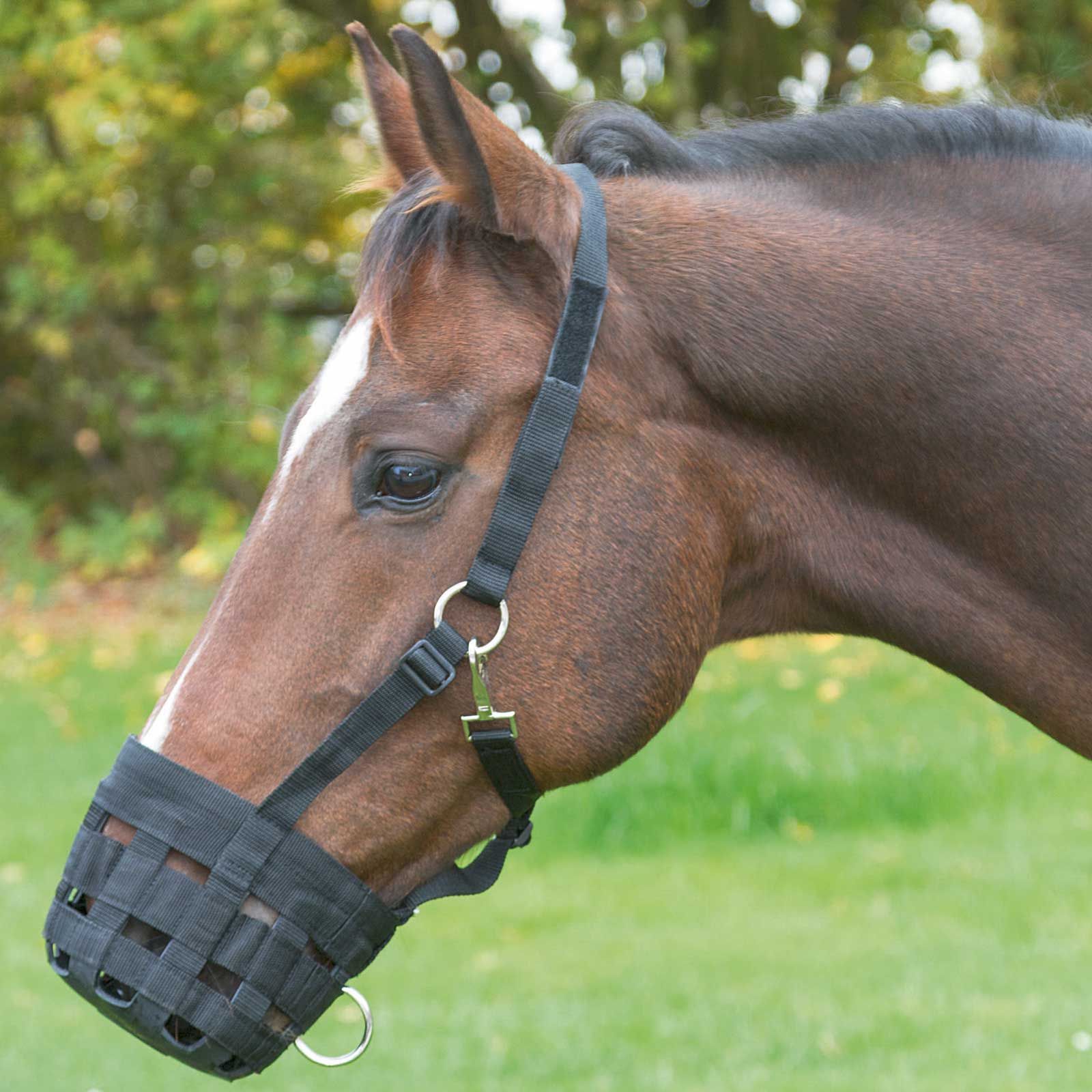 Questa museruola con cavezza integrata impedisce al vostro cavallo di mangiare troppo frettolosamente al pascolo ed è facile da attaccare. La zona del muso è ulteriormente rinforzata.