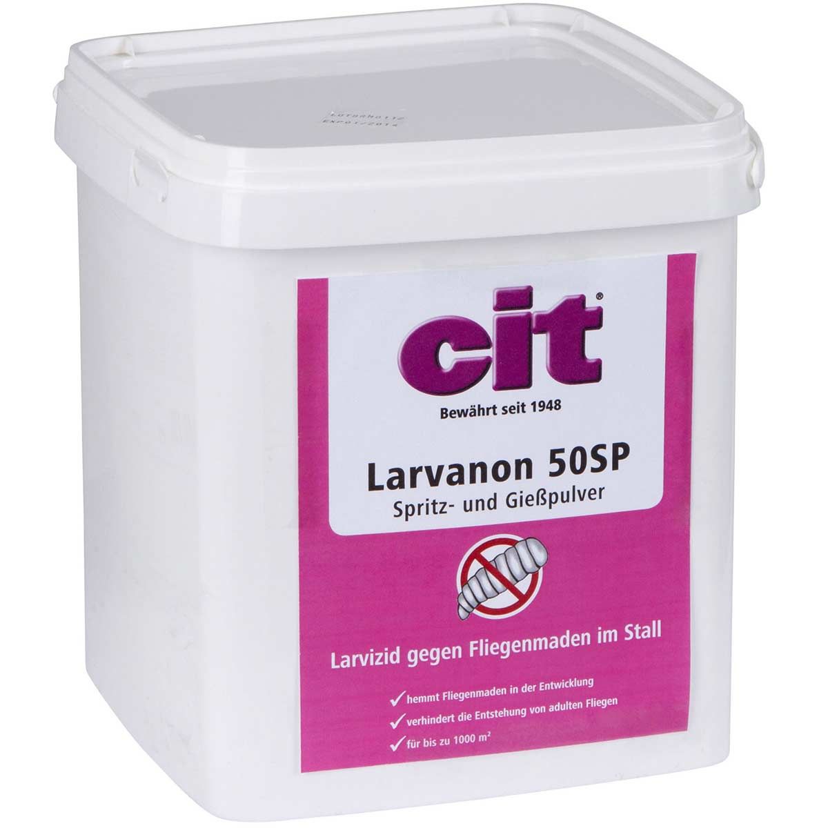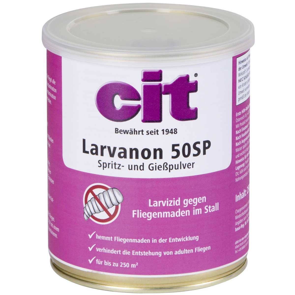 Il larvicida per mosche cit Larvanon è una polvere solubile in acqua (SP) e contiene un inibitore della crescita che agisce specificamente contro tutte le larve di mosche; è utilizzabile sia come liquido per irroratore o con un annaffiatoio. Grazie al suo elevato tenore di principio attivo Cyromazin (50 %) nel concentrato, Larvanon ha una resa molto elevata (1 g/m²). È indicato per stalle per vitelli, maiali e volatili e può essere utilizzato anche in presenza di animali.