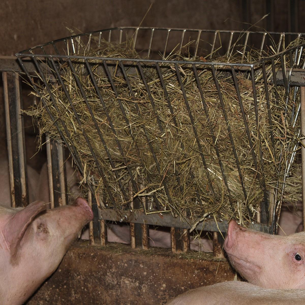 Questa rastrelliera per il fieno è particolarmente adatta per la somministrazione di materiale fibroso grezzo in alloggiamenti per suini.