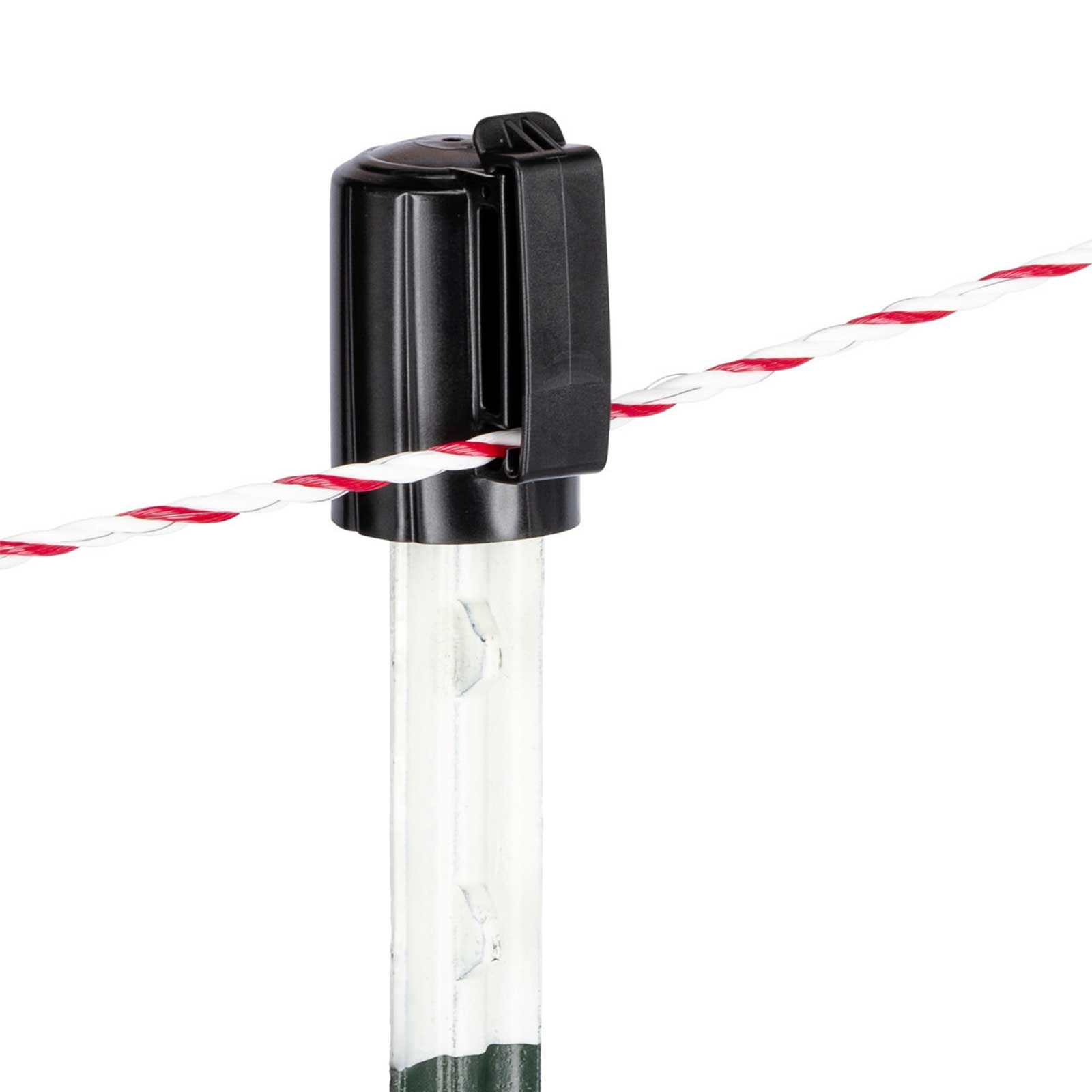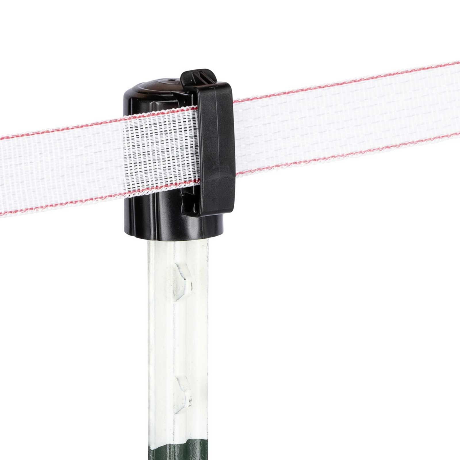 Gli isolatori di testa sono progettati per essere compatibili con nastri per recinti elettrici di larghezza fino a 40 mm e con corde o trefoli per recinti elettrici di diametro fino a 6,5 mm. Una clip aggiuntiva assicura un fissaggio stabile e impedisce che il materiale conduttivo esca dalla sede.