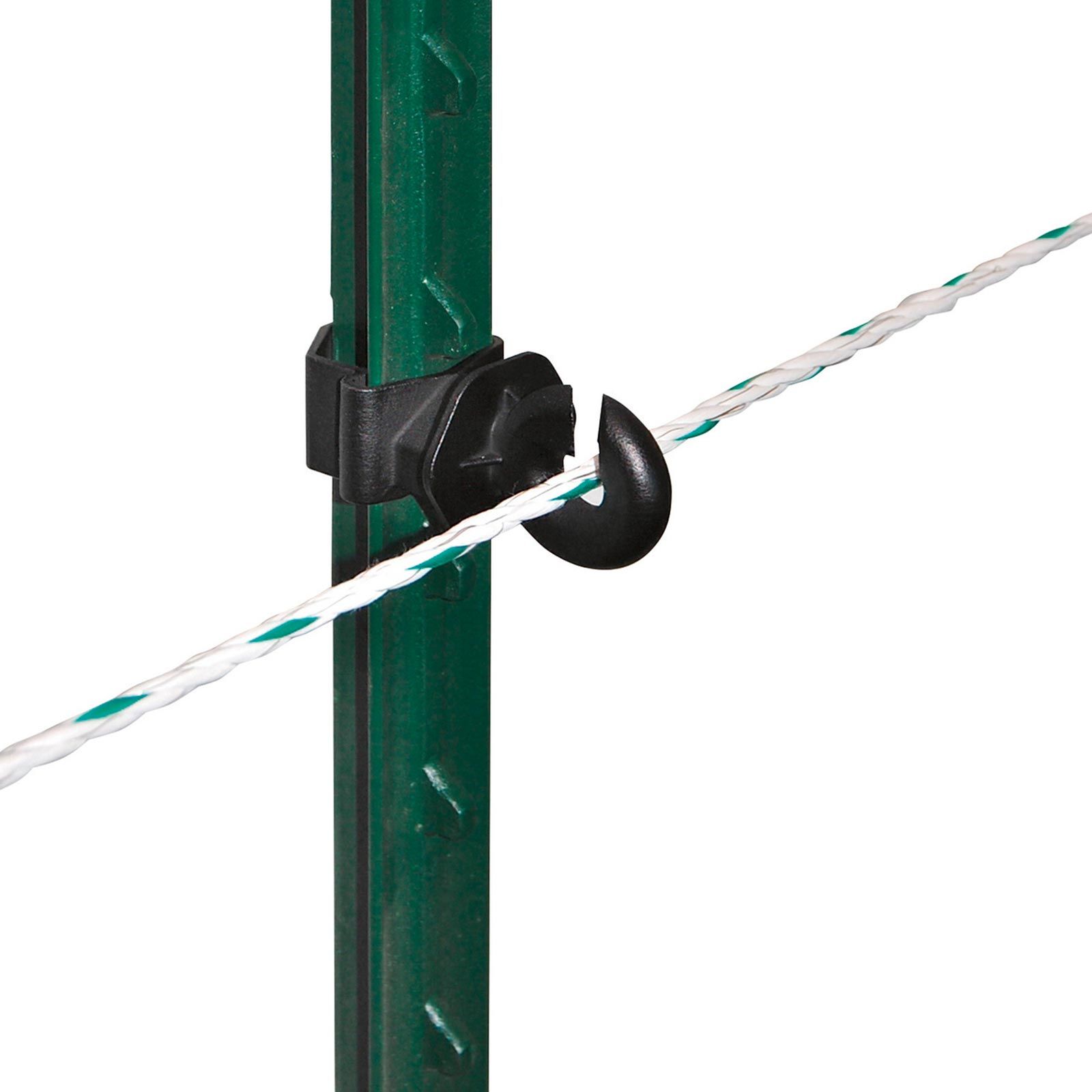 Gli isolatori ad anello con clip per paletti a T sono idonei per sistemi di recinzione permanente. Il sistema di fissaggio a clip è migliorato, idoneo per l'utilizzo con corde, fili, trefoli e nastri fino a 10 mm di larghezza. Grazie all' innovativo sistema a clip, l'isolatore si aggancia semplicemente al palo a T all'altezza desiderata. Lo scivolamento accidentale dell'isolatore è impedito dalle apposite sporgenze del paletto a T. La stabilità del materiale conduttore è assicurata anche con vento forte vento ed in caso di maltempo!