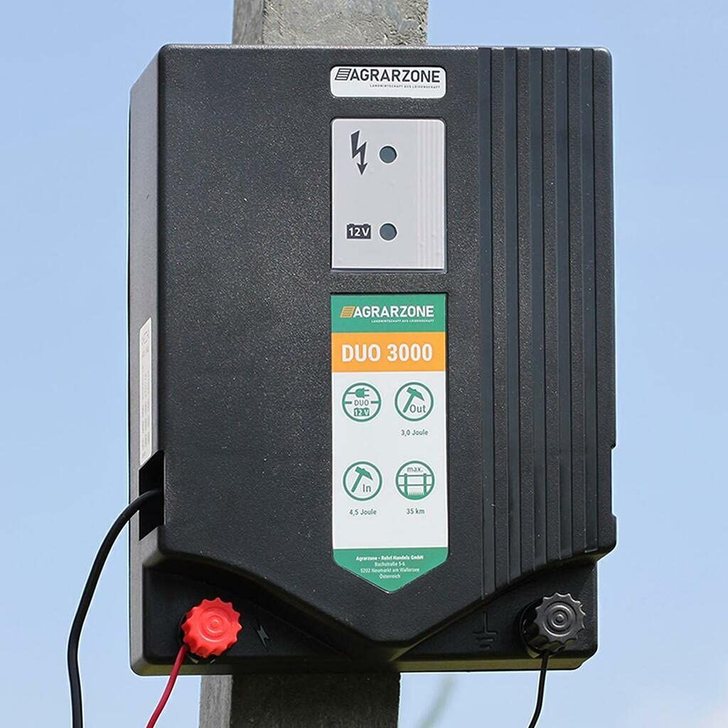 1x Elettrificatore ibrido Agrarzone DUO 3000 a 230V o 12V (incl.: 1x cavo di collegamento alla recinzione, 1x cavo di messa a terra, 1x cavo di collegamento 12V, 1x alimentatore di rete 230v 1x istruzioni per l'uso)