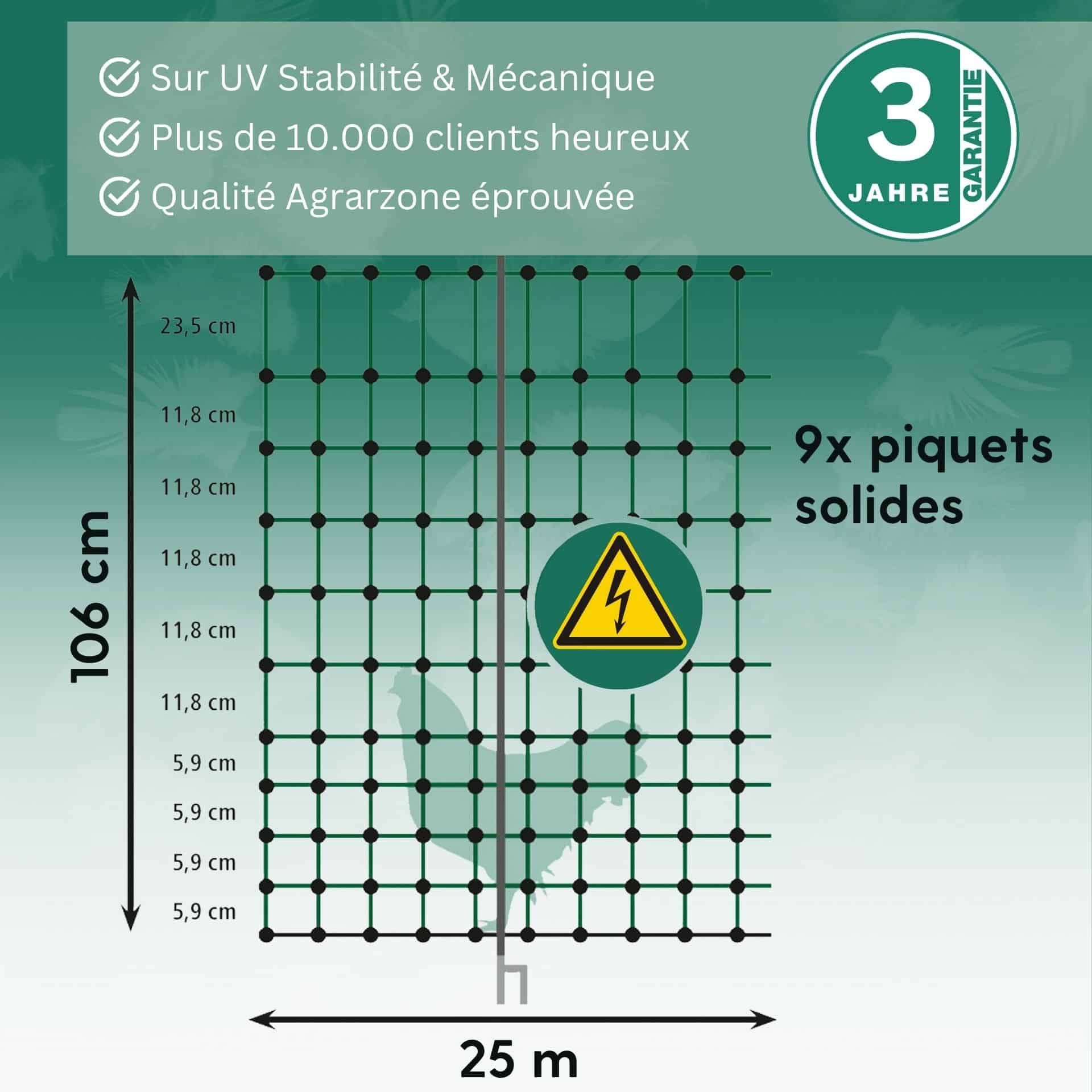 La rete per pollame Agrarzone CLASSIC è idonea per l'installazione di recinzioni semplici. Tuttavia, per massimizzare l'effetto protettivo, può essere elettrificata mediante l'utilizzo di un dispositivo idoneo (opzionale). L'elettrificazione, oltre ad impedire agli animali all'interno del recinto di danneggiare la rete, offre un elevato livello di protezione dai predatori.