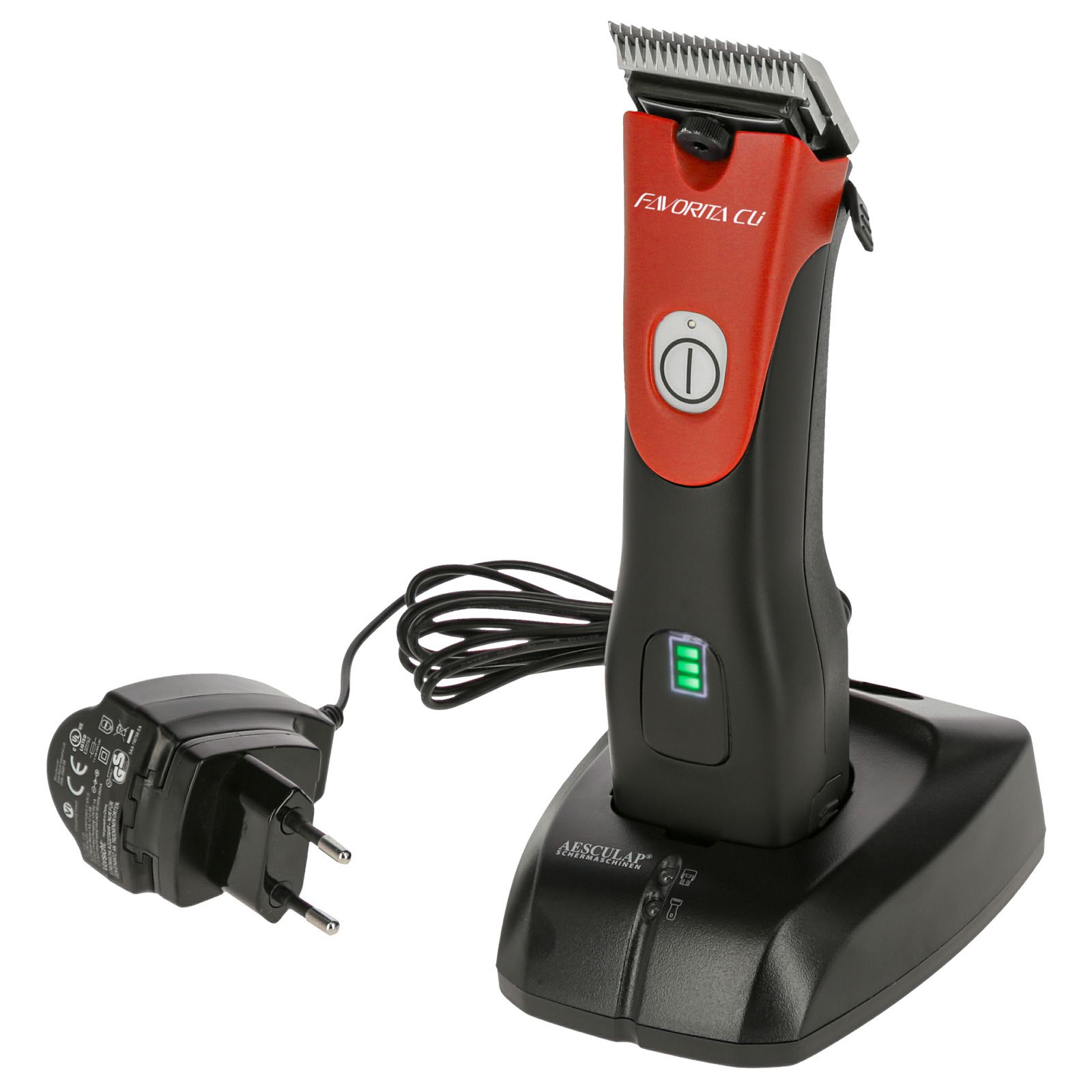Dotata di motore tipo brushless senza spazzole, la Favorita CLi di Aesculap si distingue per l'assoluta forza di trazione che le permette di raggiungere le 3.300 corse al minuto. Grazie alle batterie agli ioni al litio di ultima generazione sono garantiti tempi di funzionamento significativamente più lunghi rispetto al modello precedente, fino a 180 minuti con una singola ricarica. Dall'alloggiamento ergonomico e perfettamente bilanciato, la Aesculap Favorita CLi, grazie anche al peso di soli 390 grammi può essere saldamente impugnata e usata a lungo senza stancare l'operatore. Particolarmente silenziosa, con un'emissione sonora fino ad un massimo di 63 dB, e dalle vibrazioni ridotte, la Aesculap Favorita CLi è indicata per la tosatura di animali ansiosi o sensibili al rumore. La base di ricarica inclusa nella fornitura è corredata di indicatore a LED e vani di carica per la macchina e la batteria di ricambio.