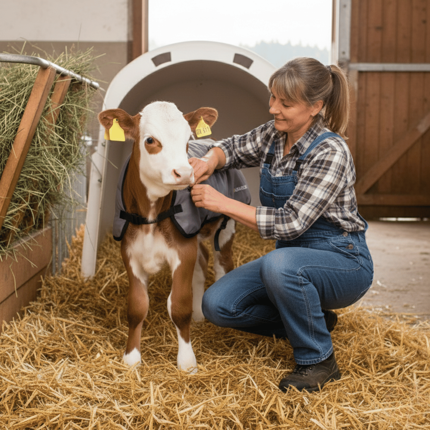 In poliestere resistente agli strappi, protegge il vitello dal freddo e ne favorisce il rapido recupero