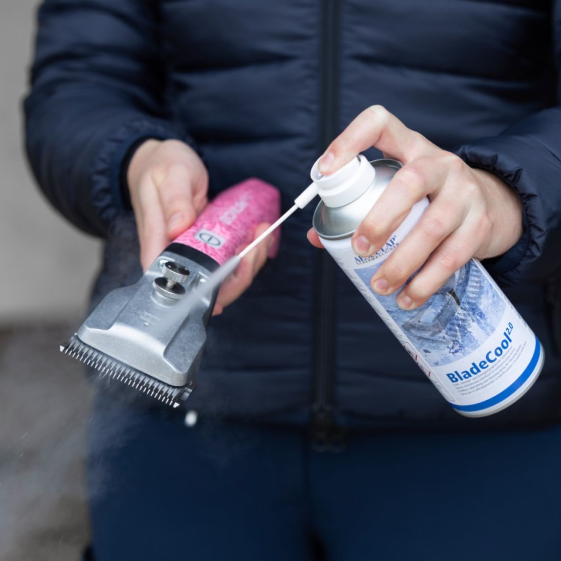 Durante la tosatura si crea attrito – e con esso calore, usura e residui di peli o pelliccia. Aesculap BladeCool 2.0 offre esattamente la soluzione a questo problema. Lo spray tecnico altamente efficace raffredda immediatamente la testina della tua tosatrice, mentre allo stesso tempo lubrifica leggermente e pulisce a fondo. Un breve spruzzo è sufficiente per curare in modo ottimale le testine durante o dopo il lavoro.