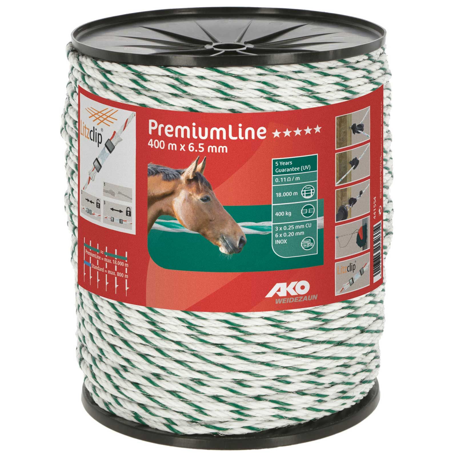 La corda per recinti elettrici Ako PremiumLine è l'ideale per l'installazione di recinti lunghi ed impegnativi ed offre la massima sicurezza per la custodia del bestiame al pascolo. Con gli spessi conduttori in rame stagnato si ottiene una conduttività di 40 volte superiore rispetto ai materiali conduttori tradizionali, mentre il robusto conduttore in acciaio inox legato conferisce una lunghissima durata. I conduttori legati in fascio garantiscono costantemente un'elevata tensione distribuita in modo uniforme all‘interno del sistema. I fili monofilamento extra spessi permettono di ottenere un carico di rottura superiore. Grazie al colore bianco-verde, la corda pur risultando ben visibile a uomini ed animali, si fonde in maniera armonica con l'ambiente, mantenendo un basso impatto visivo.