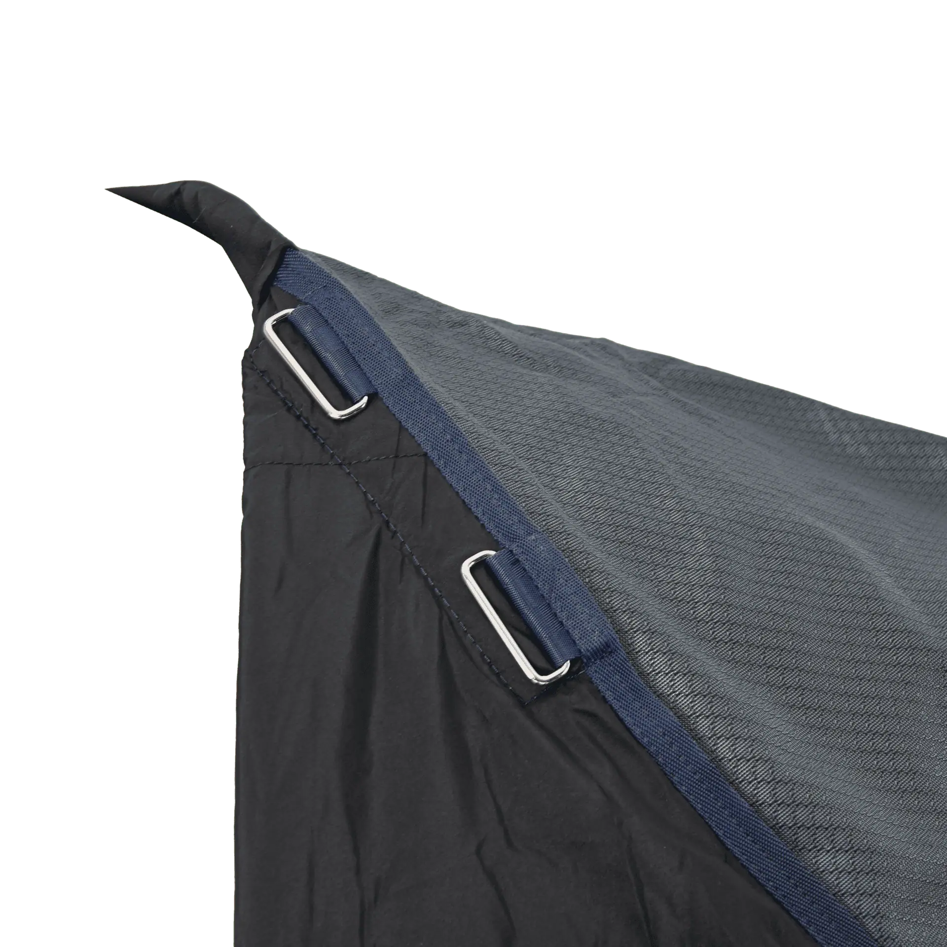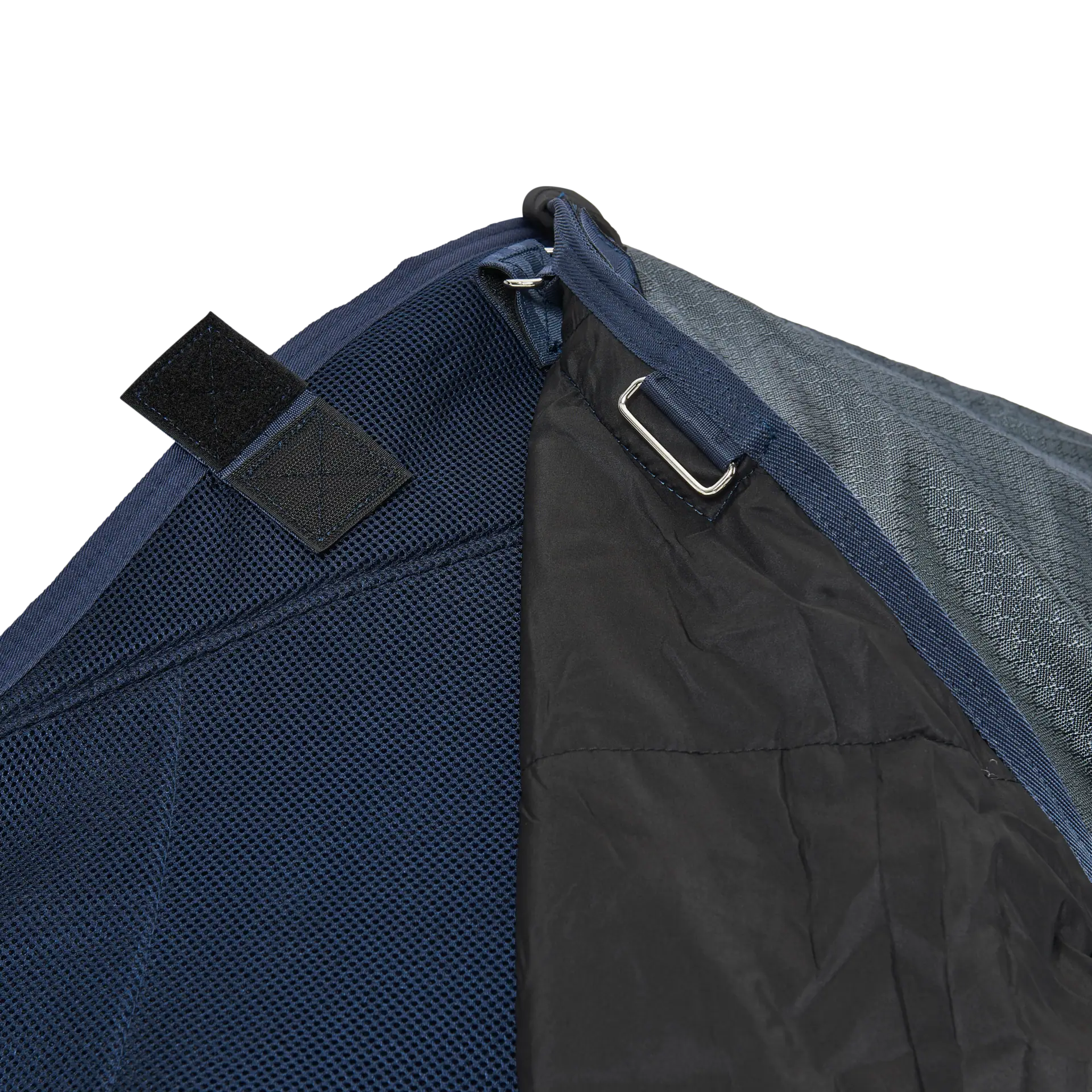 Il design della coperta offre uno spazio adeguato per le spalle del cavallo e una chiusura frontale V-Quick-Snap con velcro integrato. Include anche un sistema di attacco per un pezzo per il collo e gli anelli per l'attacco dei rivestimenti. Altri dettagli includono un cuscinetto al garrese in gomma sintetica, una cinghia addominale regolabile, un'ancoraggio elastico posteriore e un copricoda imbottito.