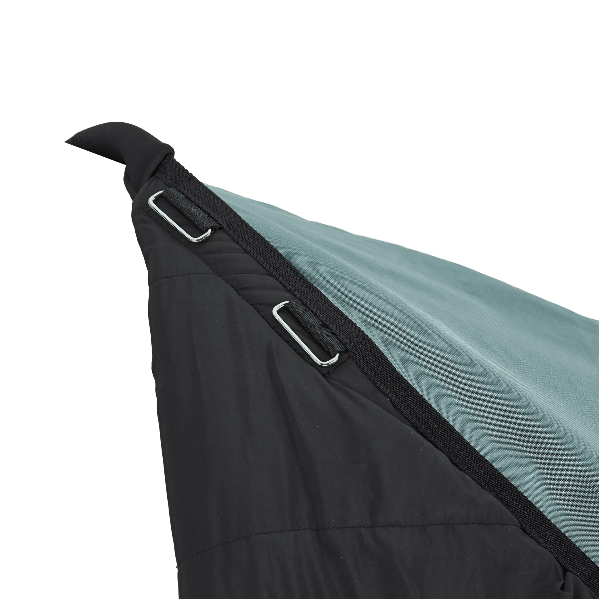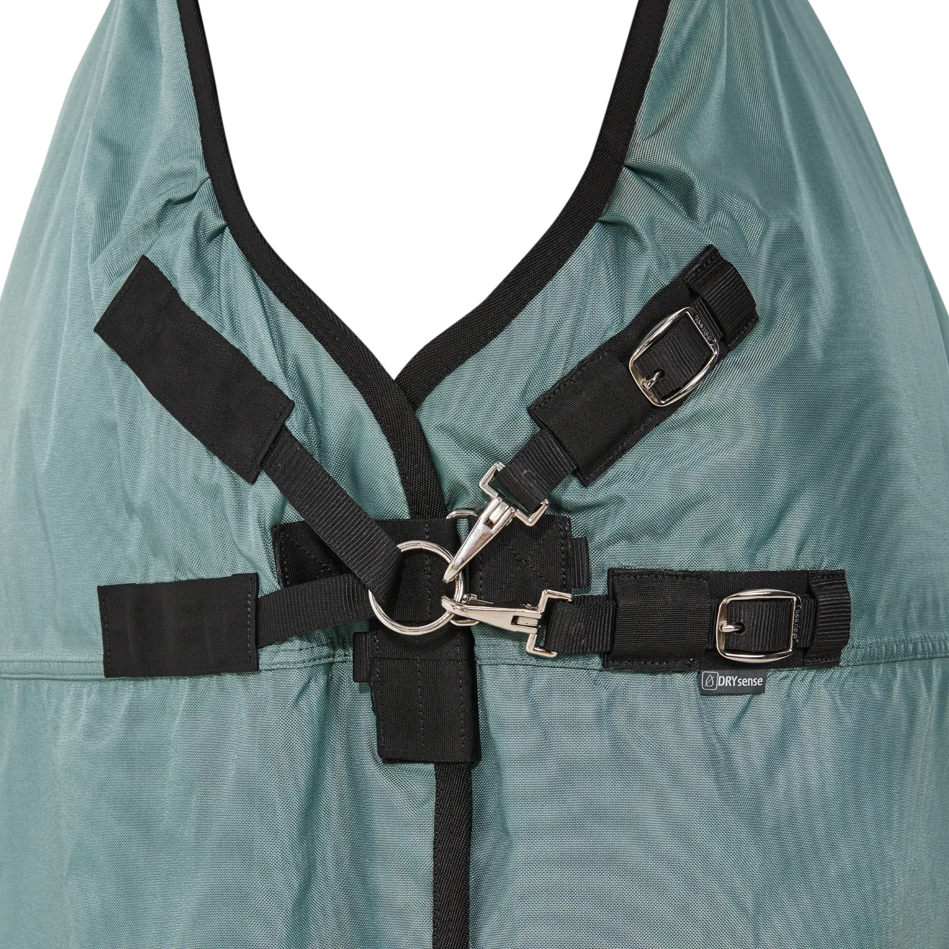 La coperta dispone di un design del petto confortevole per un adattamento ottimale alla spalla e spazio sufficiente per le articolazioni della spalla. Tra le altre caratteristiche, presenta una chiusura al petto V-Quick-Snap con doppio velcro integrato e moschettoni sostituibili, un sistema di velcro integrato per l'attacco di un colletto, occhielli integrati per il fissaggio di un Liner, un cuscinetto al garrese in gomma sintetica con superficie in jersey amica della pelle, cinghie a croce regolabili in lunghezza, un fissaggio posteriore elastico con copertura per la protezione dallo sporco, un dispositivo di fissaggio per cinghie delle gambe, e una copertura generosa per la coda imbottita.
