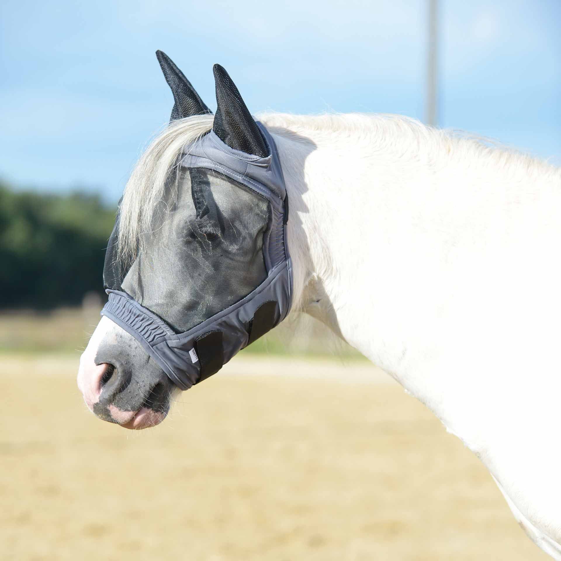La parte superiore del capo è realizzata in Lycra® nylon elastico morbido, per un'esperienza di indossabilità piacevole e duratura. Le orecchie sono di un materiale a rete morbido e ben ventilato, che mantiene le orecchie del tuo cavallo fresche anche nelle giornate più calde. Grazie al taglio generoso nella zona del collo, la maschera si adatta perfettamente, garantendo una tenuta sicura.