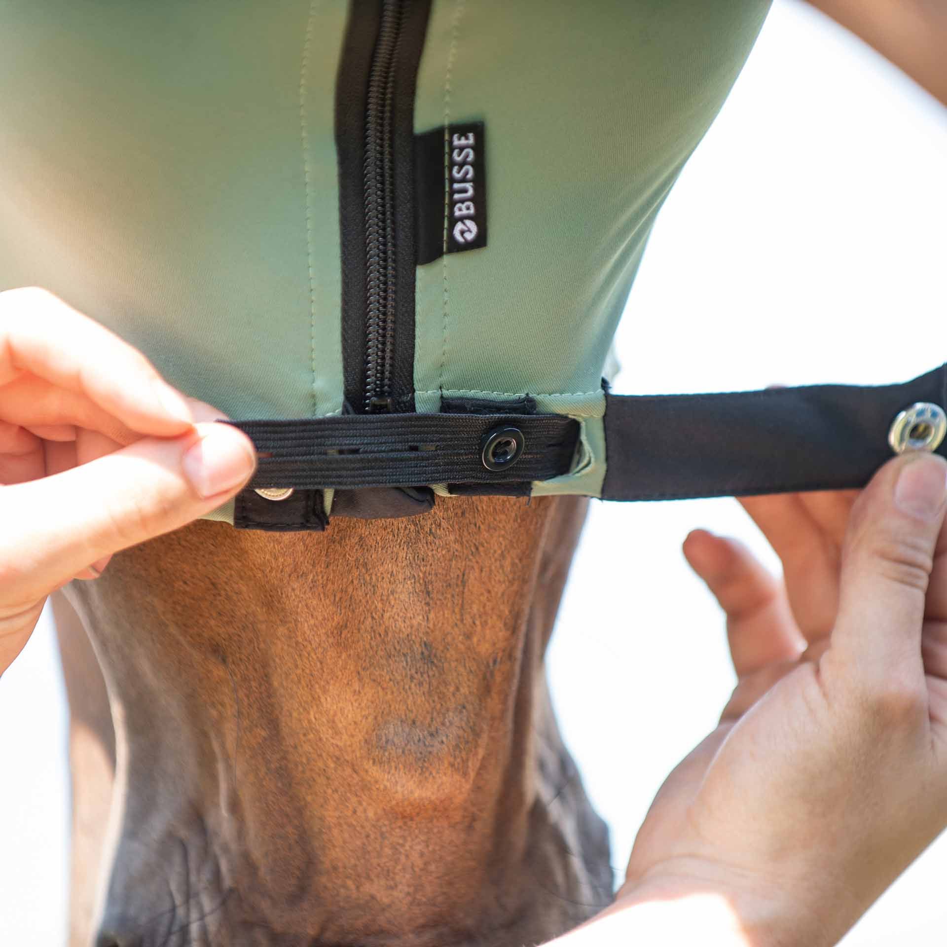 Una maschera antimosche deve adattarsi bene per poter essere d'aiuto. In caso contrario potrebbero verificarsi danni. La vestibilità deve adattarsi alla testa del cavallo/pony. È possibile apportare una regolazione finale utilizzando qualsiasi opzione di impostazione sul prodotto. Anche con una maschera antimosche adattata in modo ottimale, l'adattamento deve essere controllato regolarmente, in modo coscienzioso e professionale e corretto se necessario. Se la maschera antimosche scivola, la vista può essere limitata o persa. Per il cavallo, animale da fuga, ciò può provocare panico e causare incidenti. La seduta ideale può essere compromessa, ad esempio, da sfregamenti nella zona della testa o da conspecifici tenuti in gruppo. In questi singoli casi si sconsiglia l'uso di maschere antimosche. Controllare regolarmente il pelo e la pelle per eventuali sfregamenti. Anche con maschere antimosche che si adattano in modo ottimale, queste possono essere causate da corpi estranei (ad es. pietre, insetti) tra la maschera e il cavallo. Il rischio di irritazione della pelle aumenta a causa del sudore. Pulisci la maschera regolarmente.