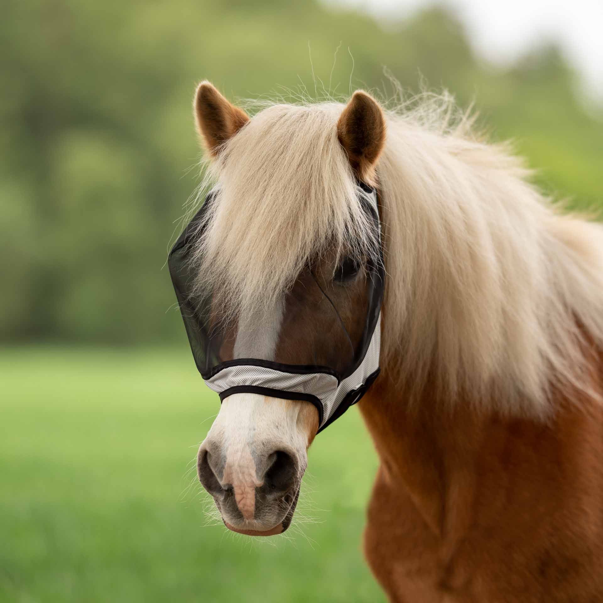 Una maschera antimosche deve adattarsi bene per poter essere d'aiuto. In caso contrario potrebbero verificarsi danni. La vestibilità deve adattarsi alla testa del cavallo/pony. È possibile apportare una regolazione finale utilizzando qualsiasi opzione di impostazione sul prodotto. Anche con una maschera antimosche adattata in modo ottimale, l'adattamento deve essere controllato regolarmente, in modo coscienzioso e professionale e corretto se necessario. Se la maschera antimosche scivola, la vista può essere limitata o persa. Per il cavallo, animale da fuga, ciò può provocare panico e causare incidenti. La seduta ideale può essere compromessa, ad esempio, da sfregamenti nella zona della testa o da conspecifici tenuti in gruppo. In questi singoli casi si sconsiglia l'uso di maschere antimosche. Controllare regolarmente il pelo e la pelle per eventuali sfregamenti. Anche con maschere antimosche che si adattano in modo ottimale, queste possono essere causate da corpi estranei (ad es. pietre, insetti) tra la maschera e il cavallo. Il rischio di irritazione della pelle aumenta a causa del sudore. Pulisci la maschera regolarmente.