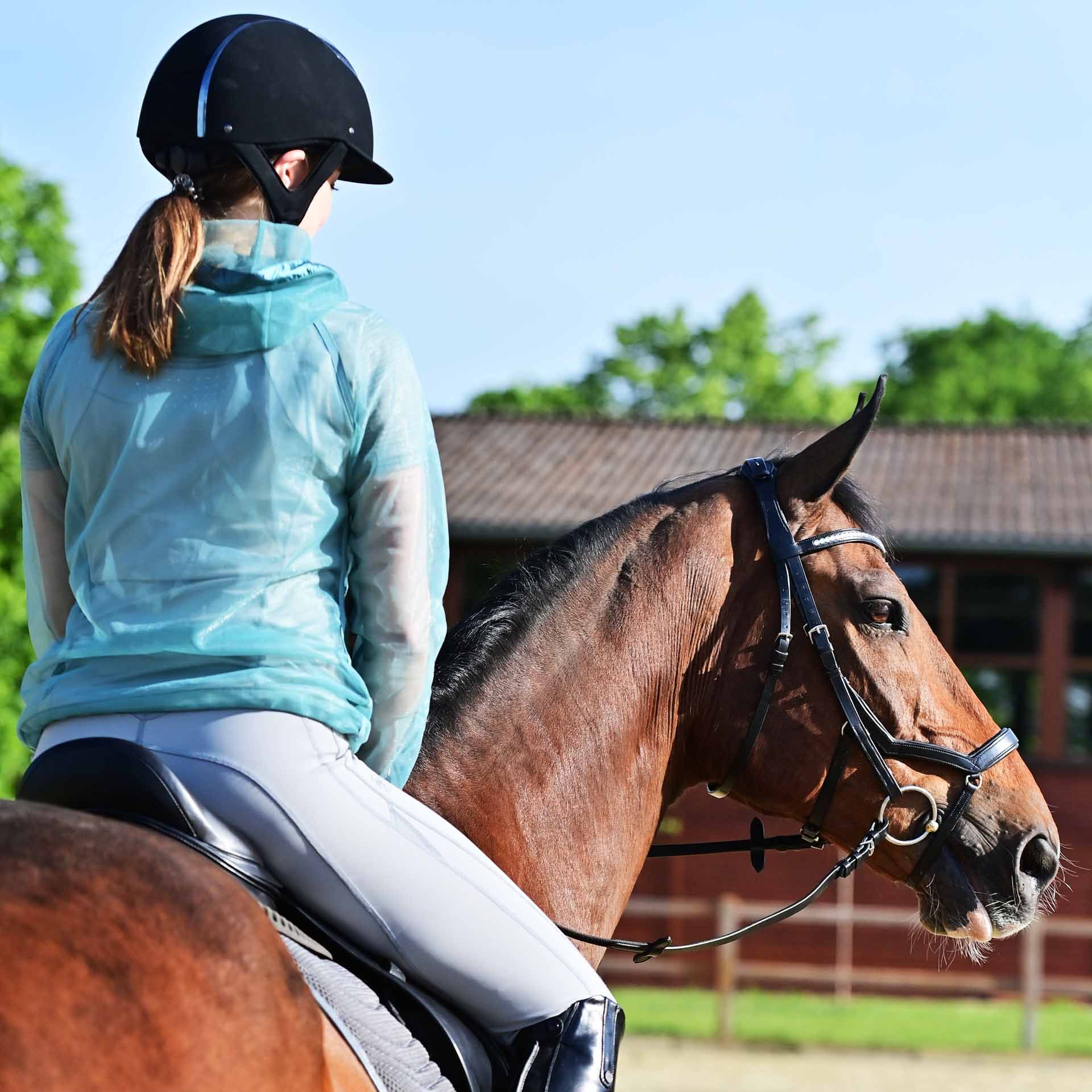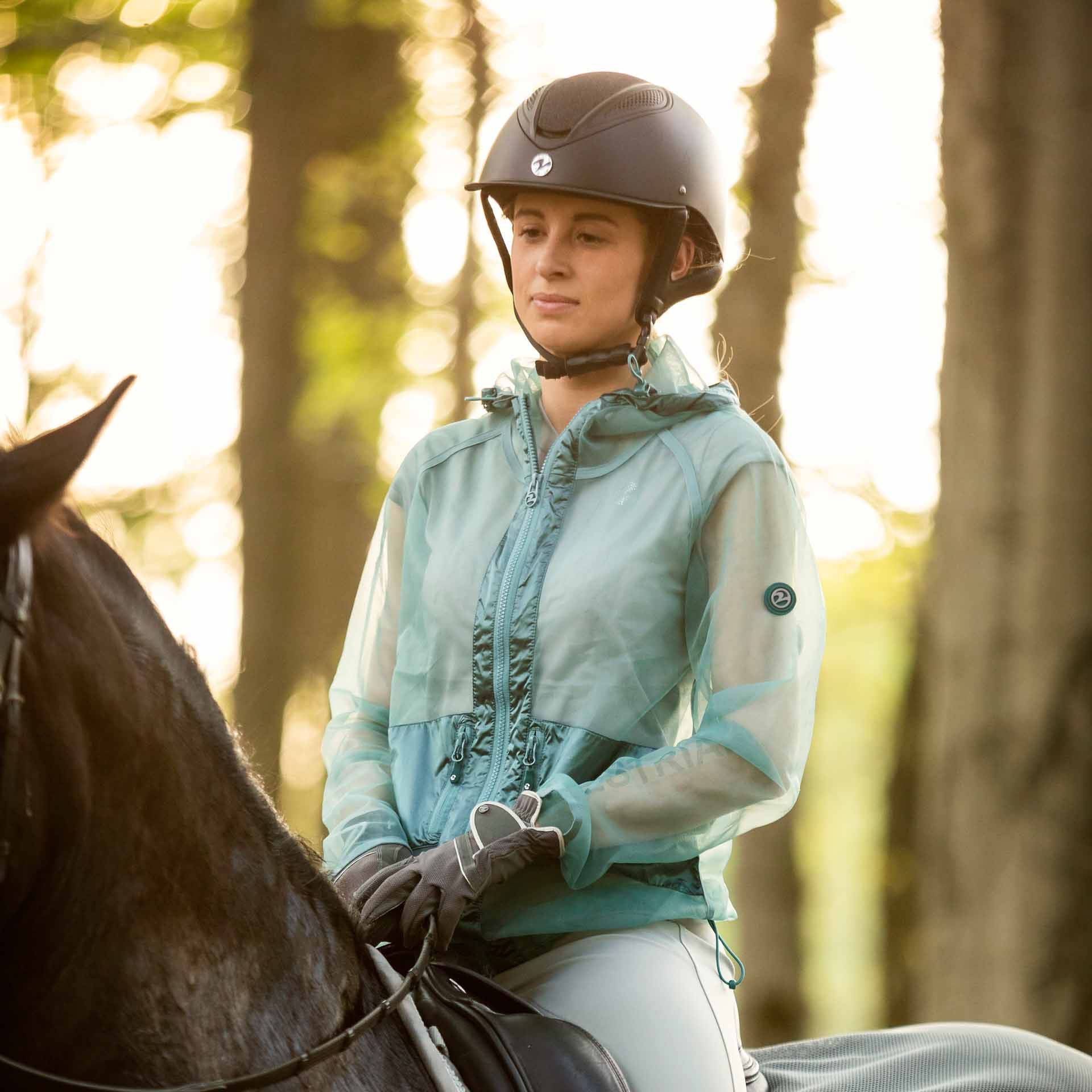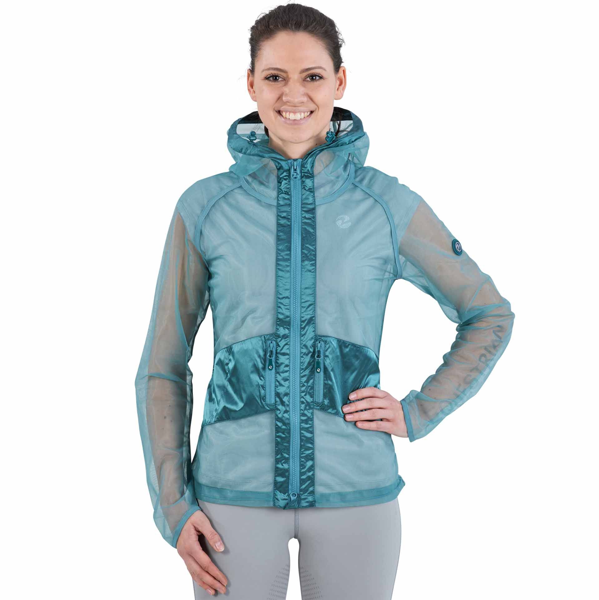 Questa giacca ha diverse funzionalità specifiche per i cavalieri: una zip principale a due vie con protezione per l'orlo e la sella per proteggere la pelle; una cappuccio regolabile che può, all'occorrenza, fornire una certa protezione anche nel viso; due capienti tasche con zip offrono spazio sufficiente per lo smartphone e piccoli oggetti a rischio di perdita; estremità delle maniche con polsini leggermente elastici in Lycra®; un cordoncino elastico regolabile individualmente all'occorrenza nella zona dell'anca per una vestibilità perfetta "a misura di cavallo".