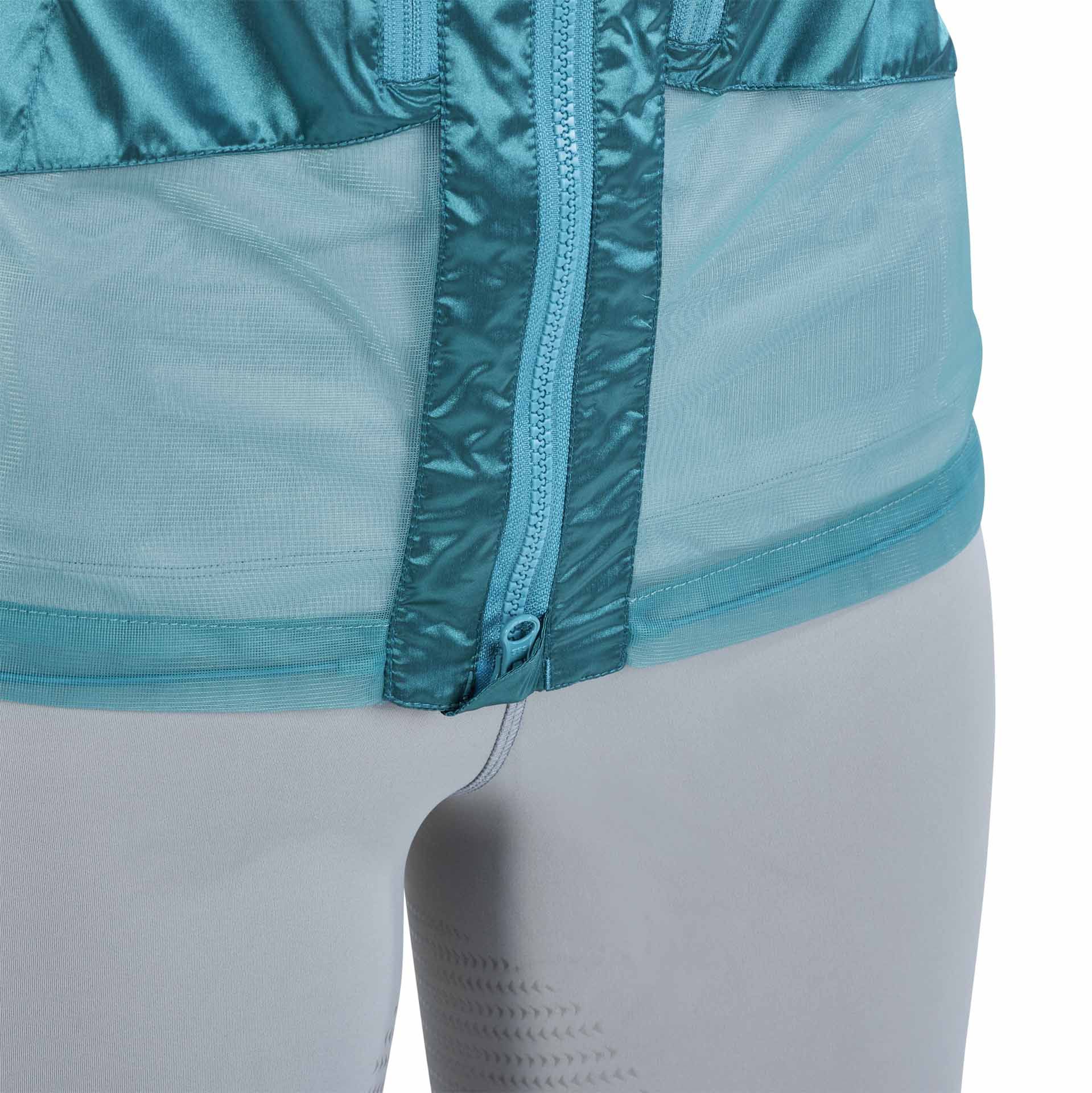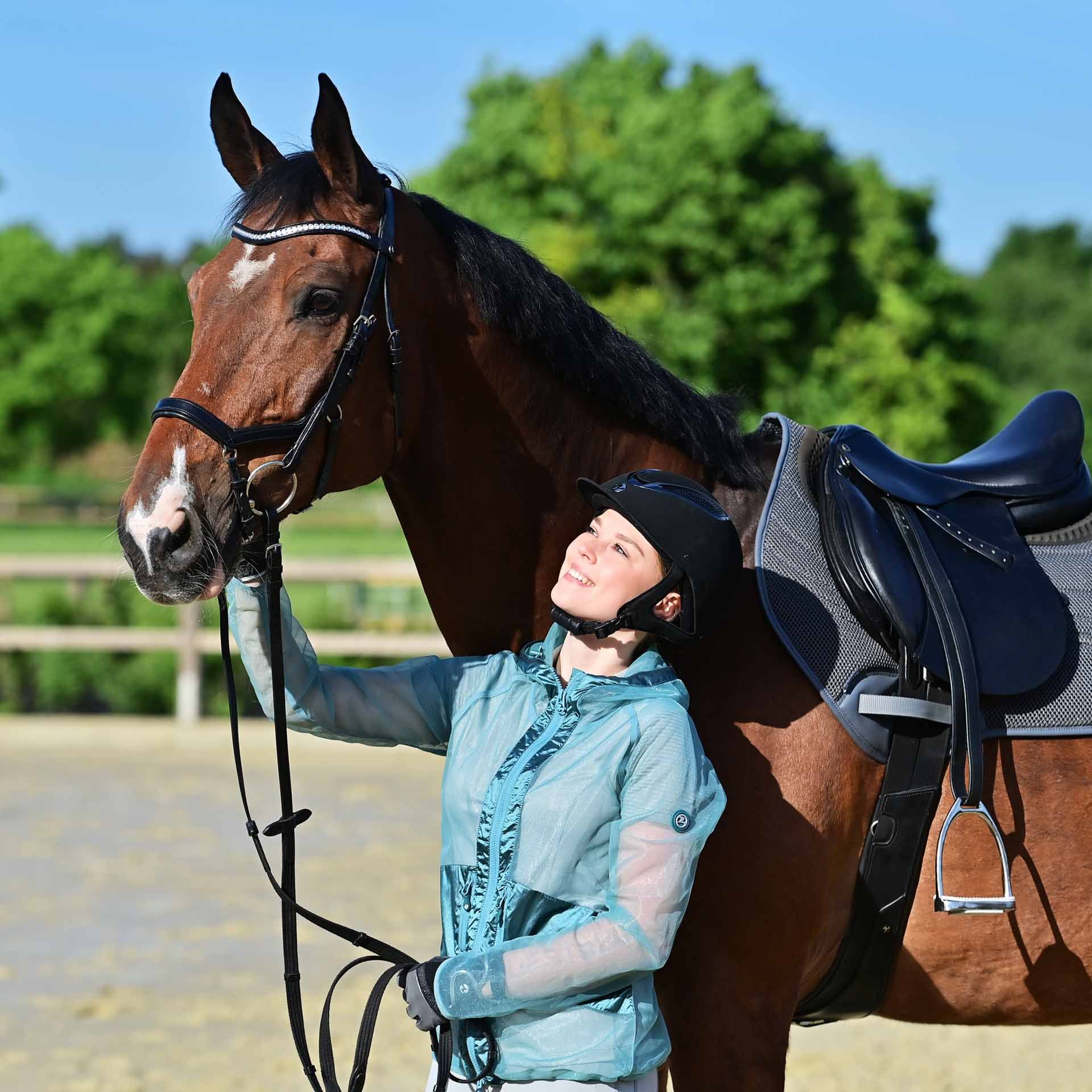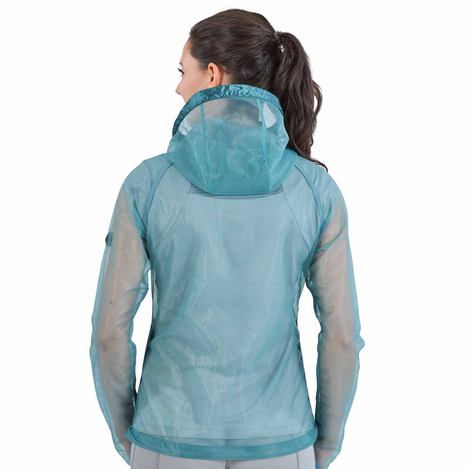 Questa giacca ha diverse funzionalità specifiche per i cavalieri: una zip principale a due vie con protezione per l'orlo e la sella per proteggere la pelle; una cappuccio regolabile che può, all'occorrenza, fornire una certa protezione anche nel viso; due capienti tasche con zip offrono spazio sufficiente per lo smartphone e piccoli oggetti a rischio di perdita; estremità delle maniche con polsini leggermente elastici in Lycra®; un cordoncino elastico regolabile individualmente all'occorrenza nella zona dell'anca per una vestibilità perfetta "a misura di cavallo".