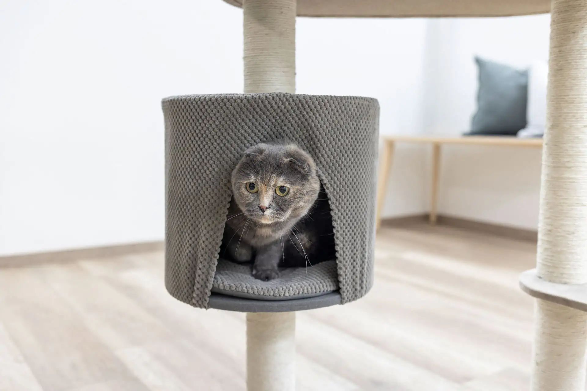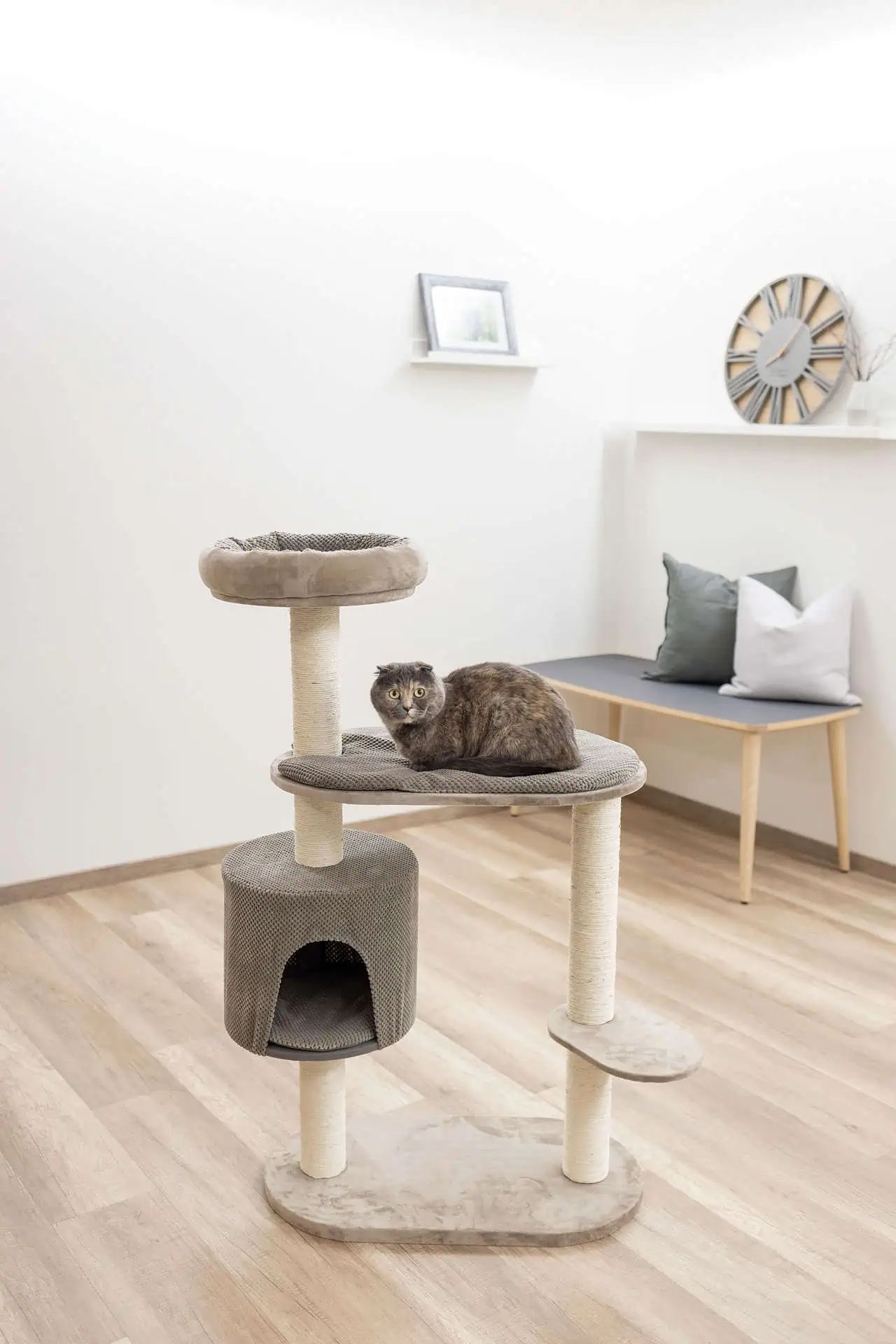 Risposta: L'Albero tiragraffi Giselle taupe offre un'area di riposo con cuscino removibile e lavabile, una grotta e un letto per ulteriori spazi di riposo.