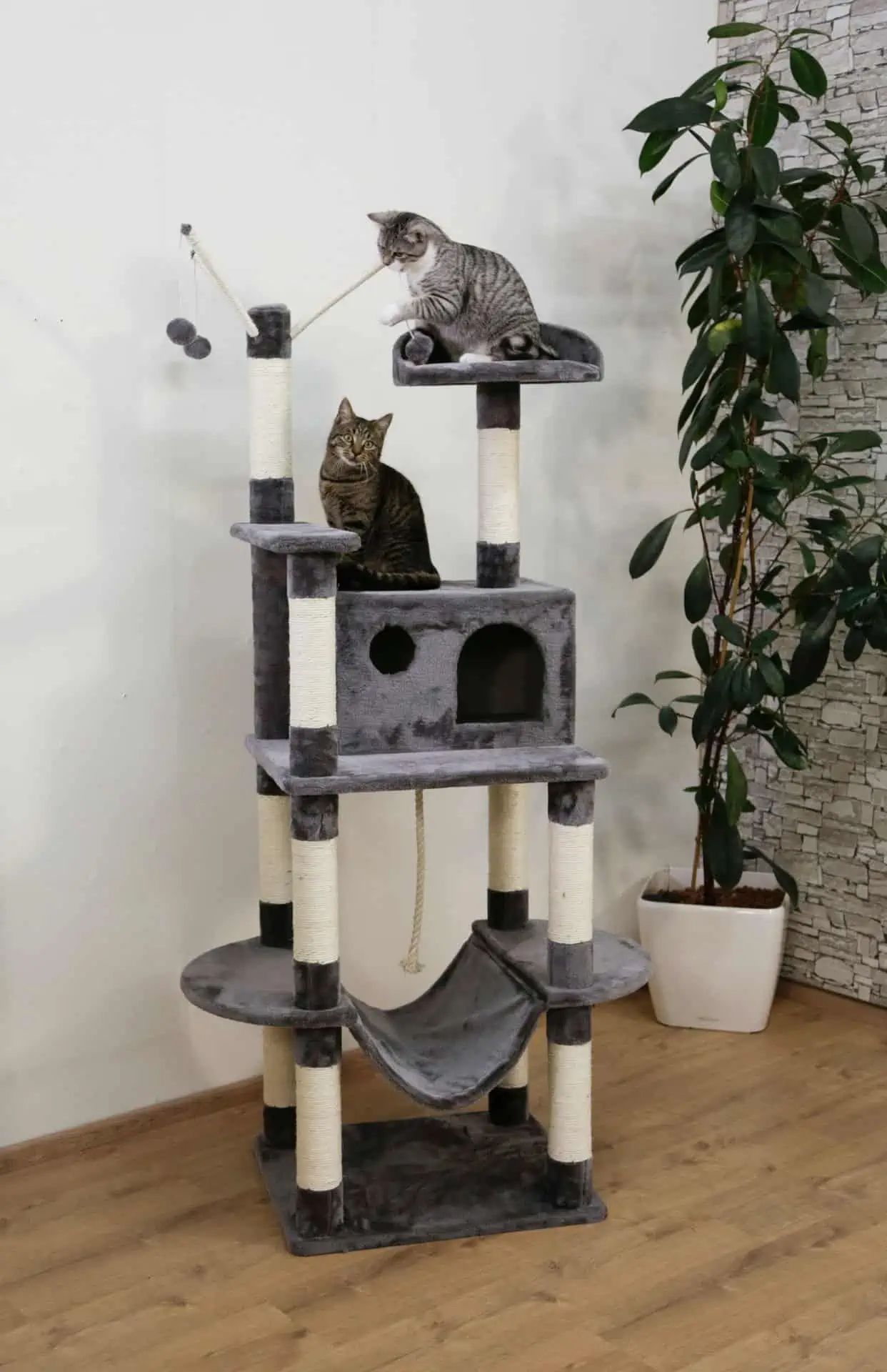 Presentiamo l'Albero tiragraffi Matteo con nicchia grigio, 59x52x180, un moderno e stabile albero tiragraffi con molti luoghi di gioco e riposo. Progettato con una grotta extra grande di 45,5 x 30,5 x 29 cm, una amaca di 35 x 49 cm e un letto di riposo con bordo di 39 cm di diametro, l'Albero tiragraffi Matteo è il luogo ideale per ogni gatto amante del gioco e del comfort.