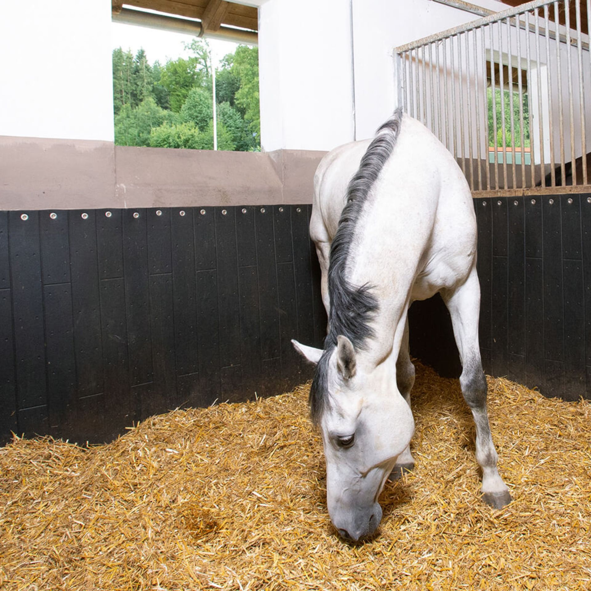 Sì, il paracolpi in gomma funge da protezione dagli urti per zoccoli e gambe, preservando così le pareti della scuderia. Grazie all'eccellente capacità di ammortizzazione, molti cavalli perdono addirittura la voglia di battere ripetutamente contro la parete.