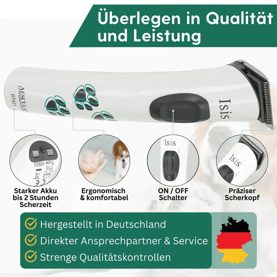 Un ulteriore punto di forza è il funzionamento silenzioso e privo di vibrazioni della macchina Aesculap. Questo contribuisce a un'esperienza di tosatura senza stress, facendo sentire a proprio agio anche gli animali più sensibili. La qualità "MADE IN GERMANY" la distingue nettamente da modelli più economici, ed è apprezzata dai proprietari di cani.