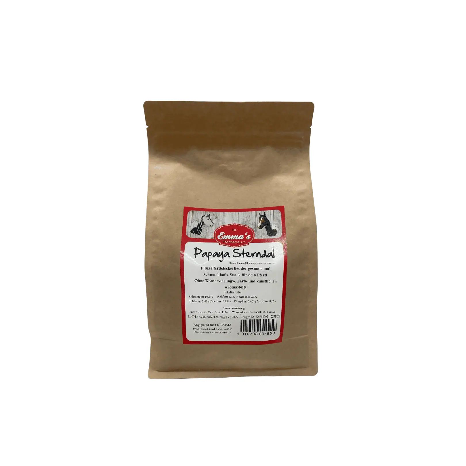Grazie agli ingredienti di alta qualità come papaya e carruba, questo biscotto non solo ha un sapore speciale, ma offre anche nutrienti preziosi. È ideale per i proprietari di cavalli che tengono alla salute e alla naturalezza dell'alimentazione dei loro animali. I biscotti per cavalli Emmas gusto papaya sono perfetti per coloro che desiderano offrire una ricompensa naturale e deliziosa ai loro cavalli.
