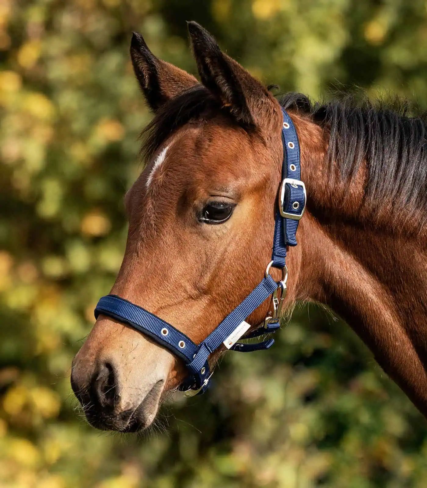Raffinata capezza per puledro in materiale pregiato con fibbieria lucida nichelata argento. Capezzina, sottogola e sovracapo regolabili.