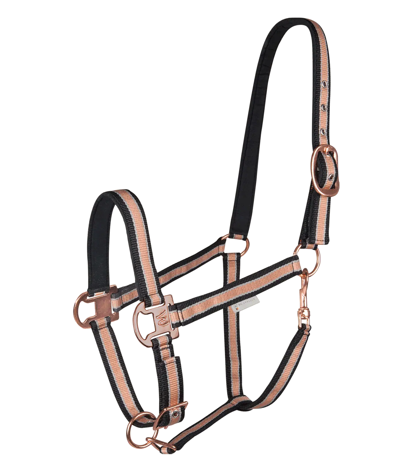 Capezza con morbido rivestimento, regolabile. Con fibbieria color oro rosa o argentata. Regolabile al sovracapo e al sottomento (da un lato). Da abbinare alle lunghine Shine Art. 50489 & 50490.