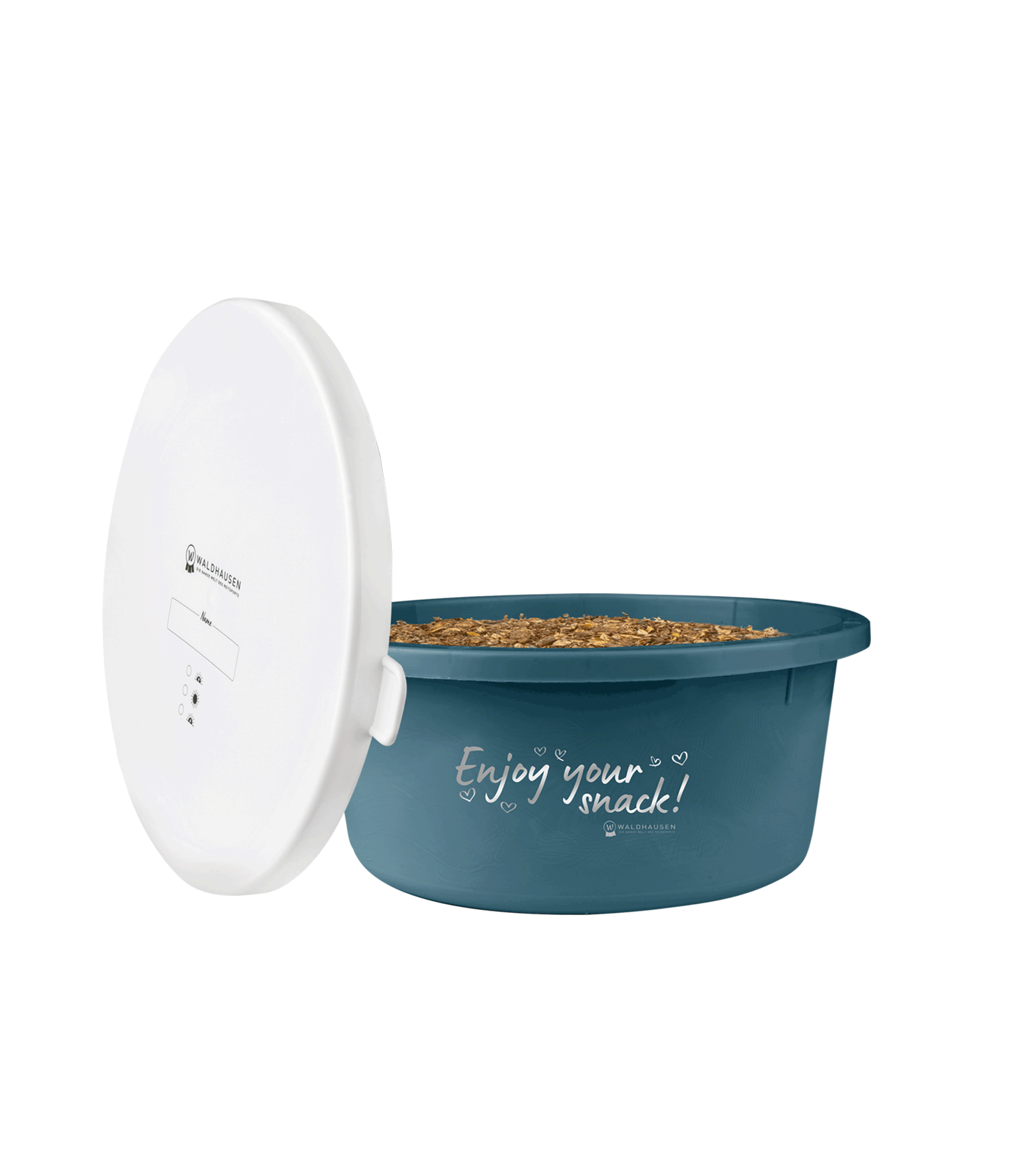 Waldhausen Piccola ciotola per mangimi "Enjoy your snack" con coperchio, blu petrolio