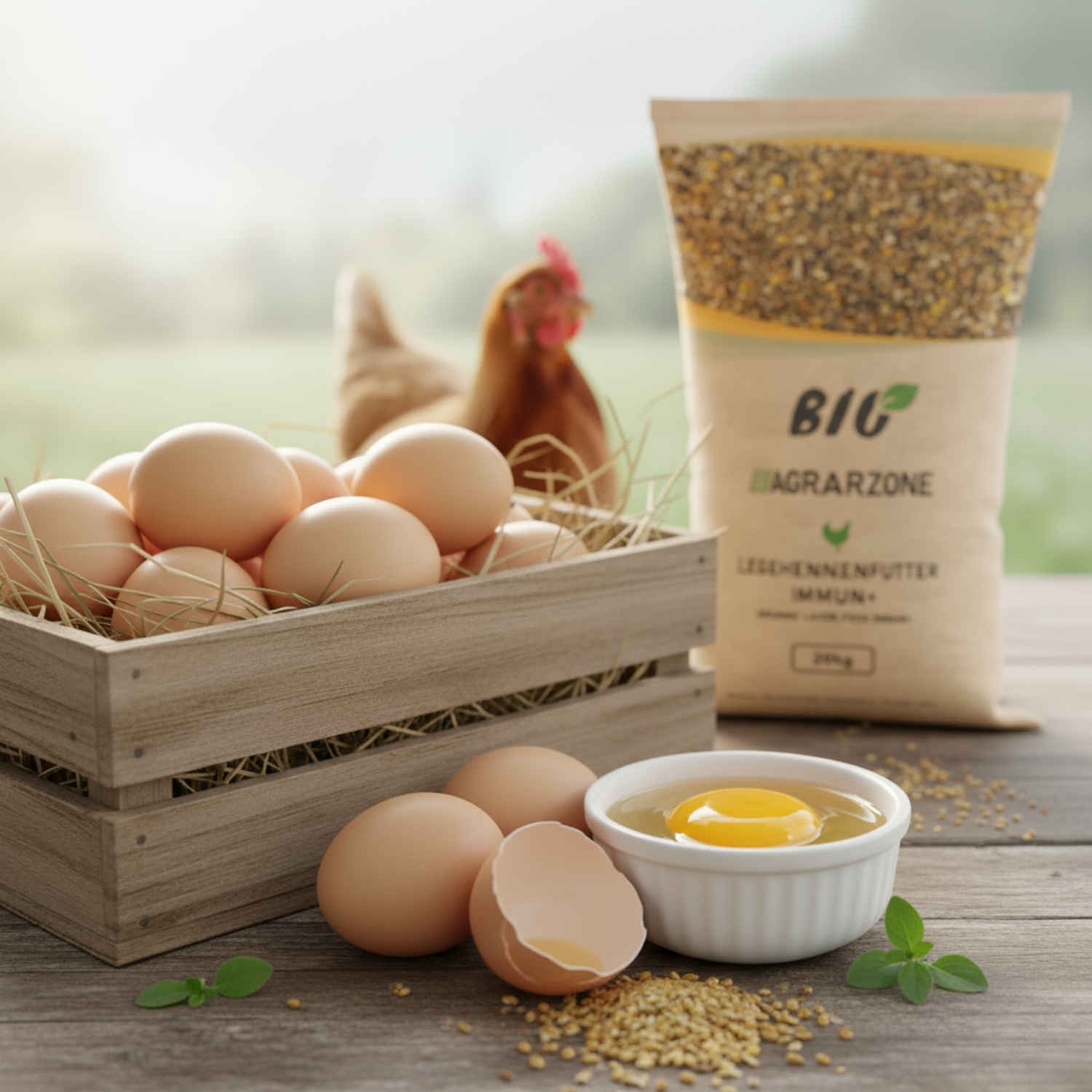 Our ImmunPlus is much more than just feed - it's a natural shield for your chickens. This unique organic blend of oregano and selected herbal extracts was developed to strengthen your hens' immune system and stabilize gut health.Oregano is known for its natural antibacterial properties and helps to gently protect your animals from harmful germs and inflammation. The special formula also acts as an appetite stimulant, which improves feed intake and feed conversion. This leads not only to more vital chickens but also to more robust eggshells. With a lot of love and expertise, we ensure that you receive a premium feed that sustainably promotes the health of your laying hens.