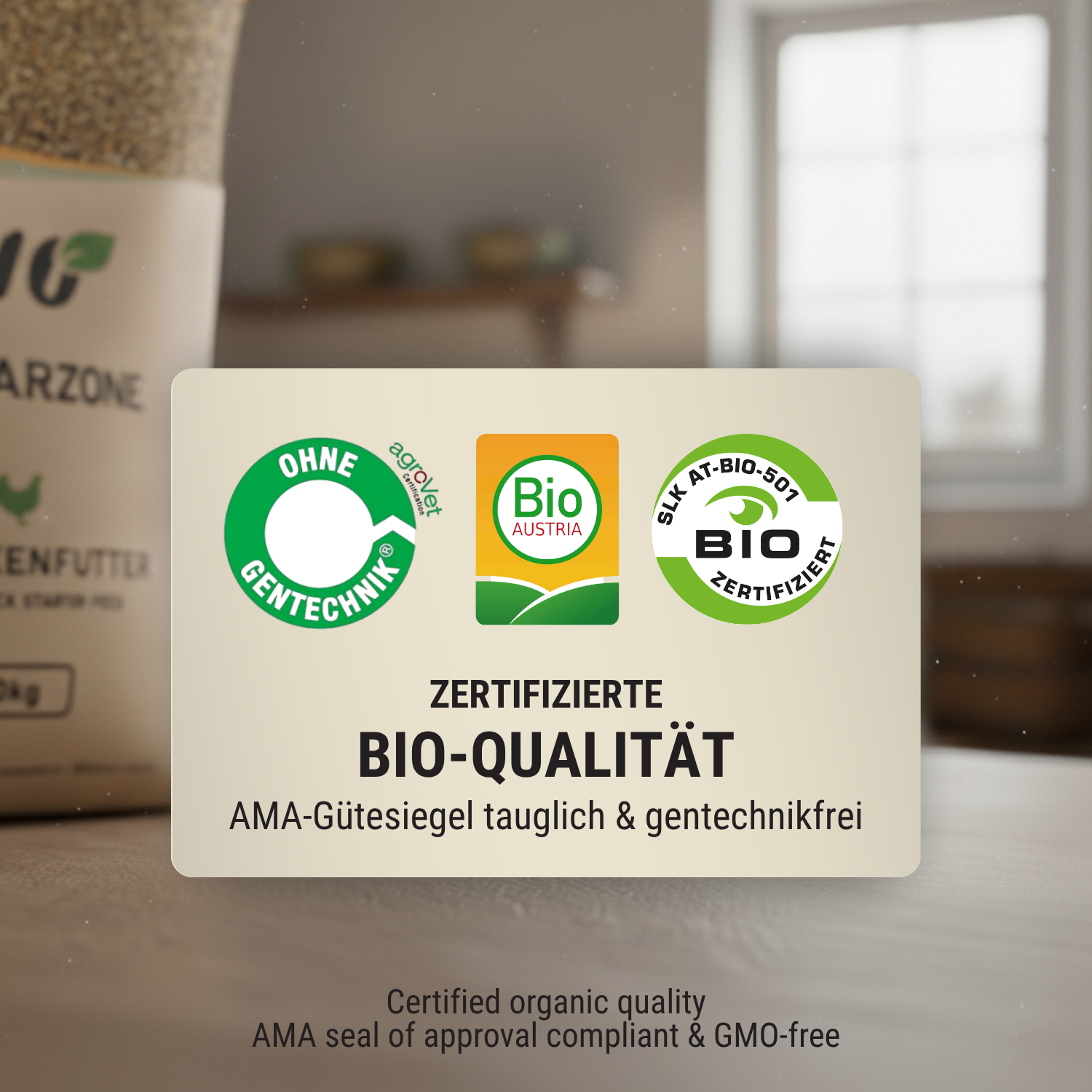 Il mangime si distingue per la sua struttura granulare e la lavorazione a basso contenuto di polvere, facilitando l'alimentazione e sostenendo la salute dei tuoi animali. È certificato con il sigillo di qualità pastus+ AMA ed è quindi perfettamente adatto all'agricoltura biologica.