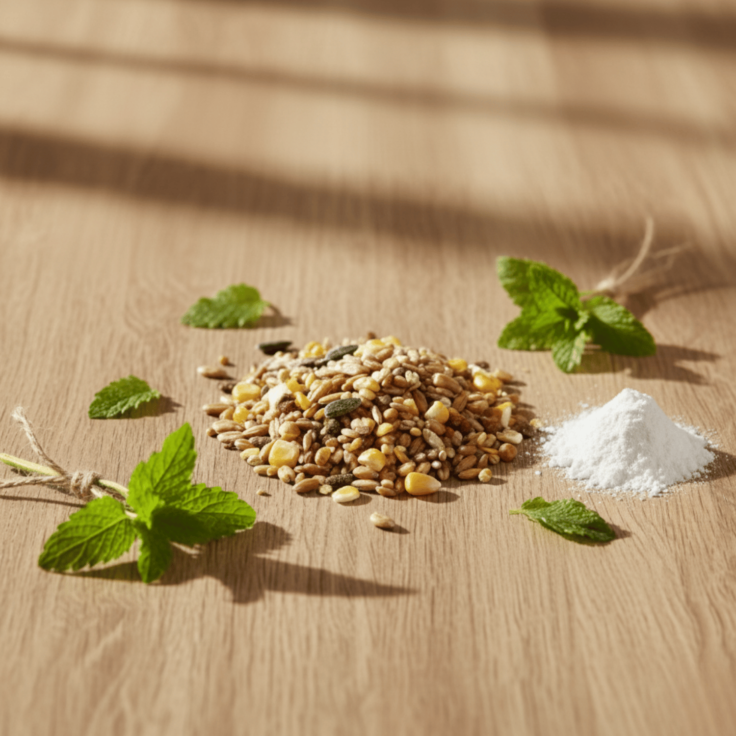Composizione: Grano, Mais macinato grosso, Orzo da birra, Solfato di magnesio, Ossido di magnesio, Miglio giallo, Sorgo (Milokorn), Semi di girasole striati, Composti aromatici (da estratto di agrumi e chiodi di garofano) contro i parassiti, Composti aromatici (Melissa), con effetto di riduzione dello stress.