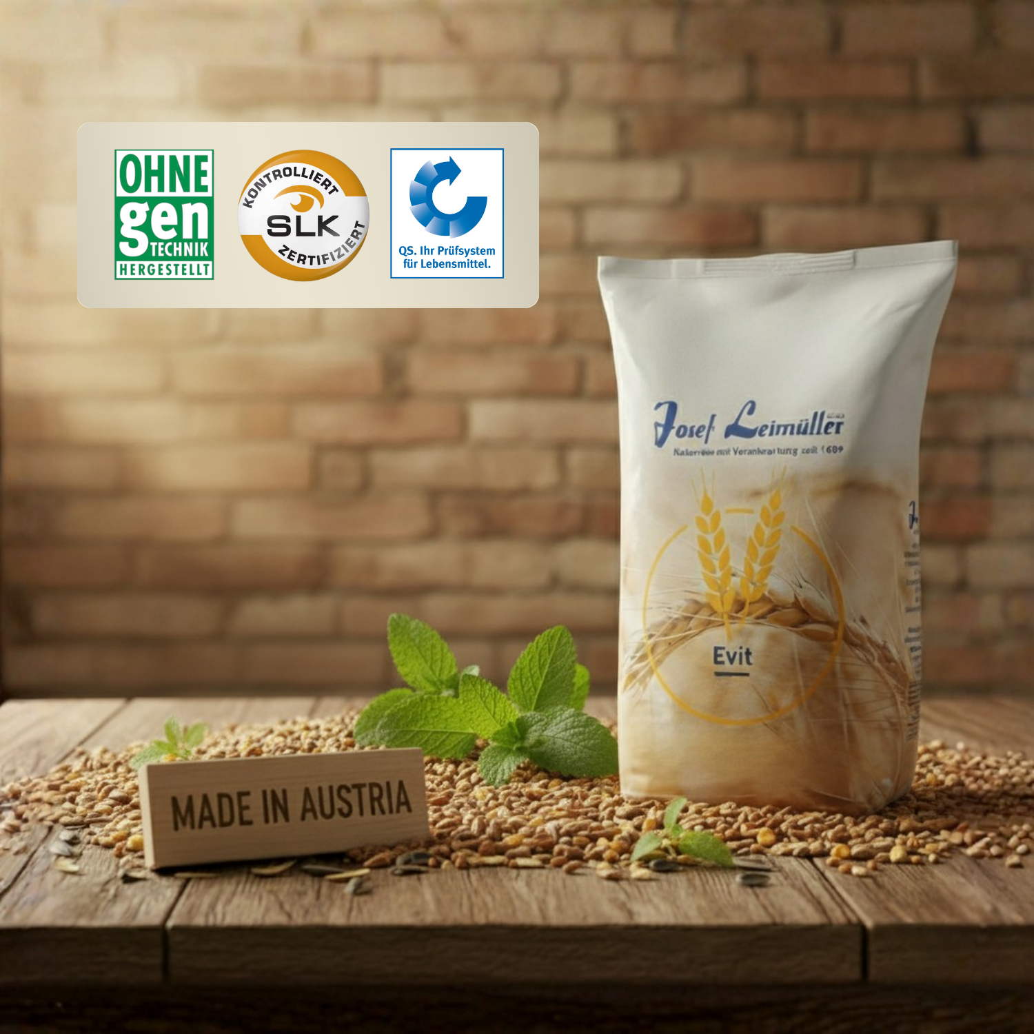 Come azienda familiare Leimüller, produciamo mangimi freschi e naturali da oltre 400 anni a Neumarkt am Wallersee. Garantiamo assoluta trasparenza e utilizziamo solo materie prime regionali di alta qualità, che superano i nostri rigorosi controlli di qualità. La nostra promessa: il mangime è garantito privo di polvere e di OGM, controllato e certificato da SLK GmbH. Molti prodotti sono idonei al Sigillo di Qualità AMA, e la nostra certificazione QS ti garantisce l'osservanza dei più rigorosi standard di qualità.