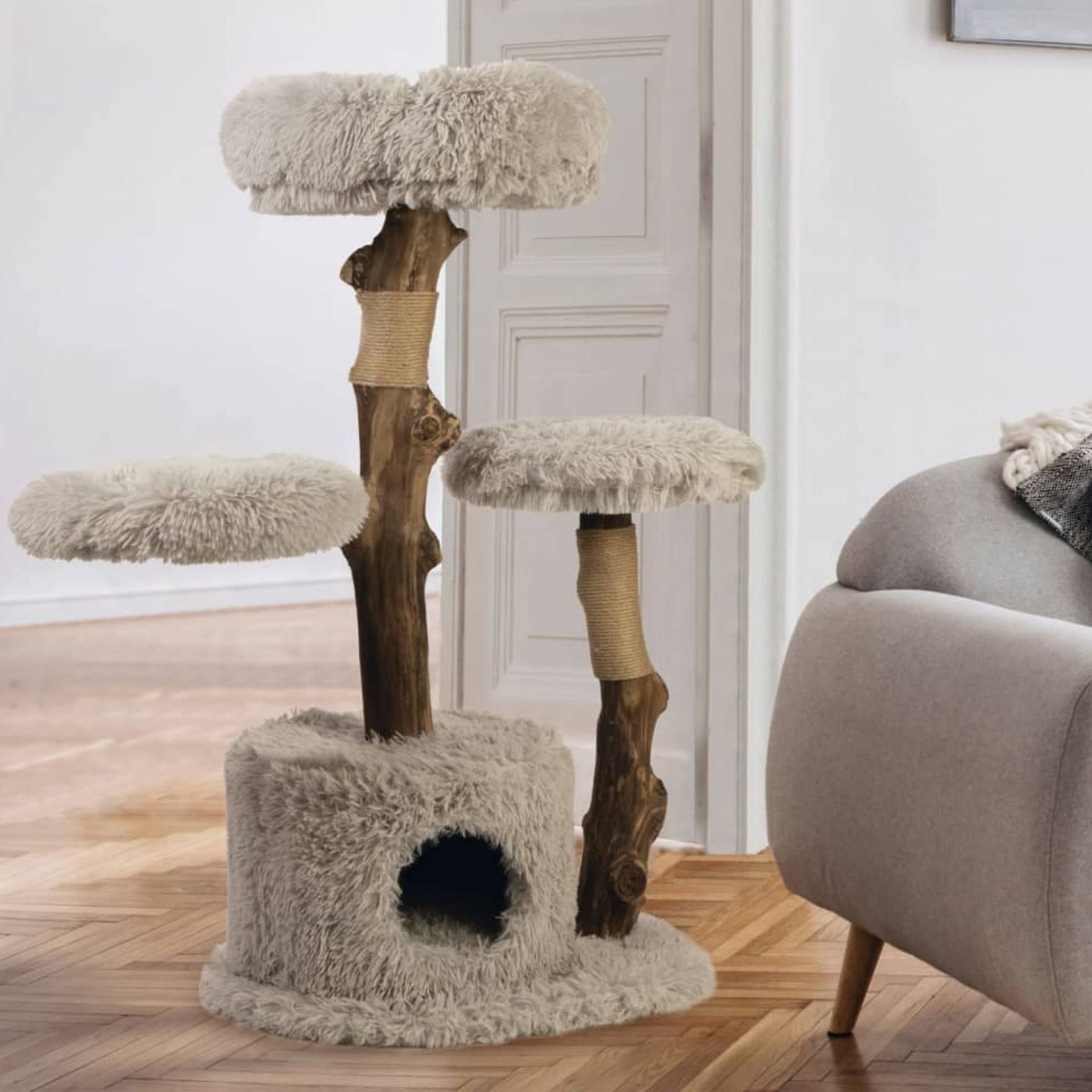 L'albero tiragraffi ha un aspetto discreto e si adatta con stile a qualsiasi arredamento. Sotto la base, i piedini antiscivolo garantiscono una maggiore stabilità e impediscono alla torre di muoversi involontariamente. Poiché l'albero tiragraffi è realizzato in legno naturale, ogni esemplare è unico e può differire leggermente dall'immagine: un fascino naturale che rende ogni pezzo speciale.