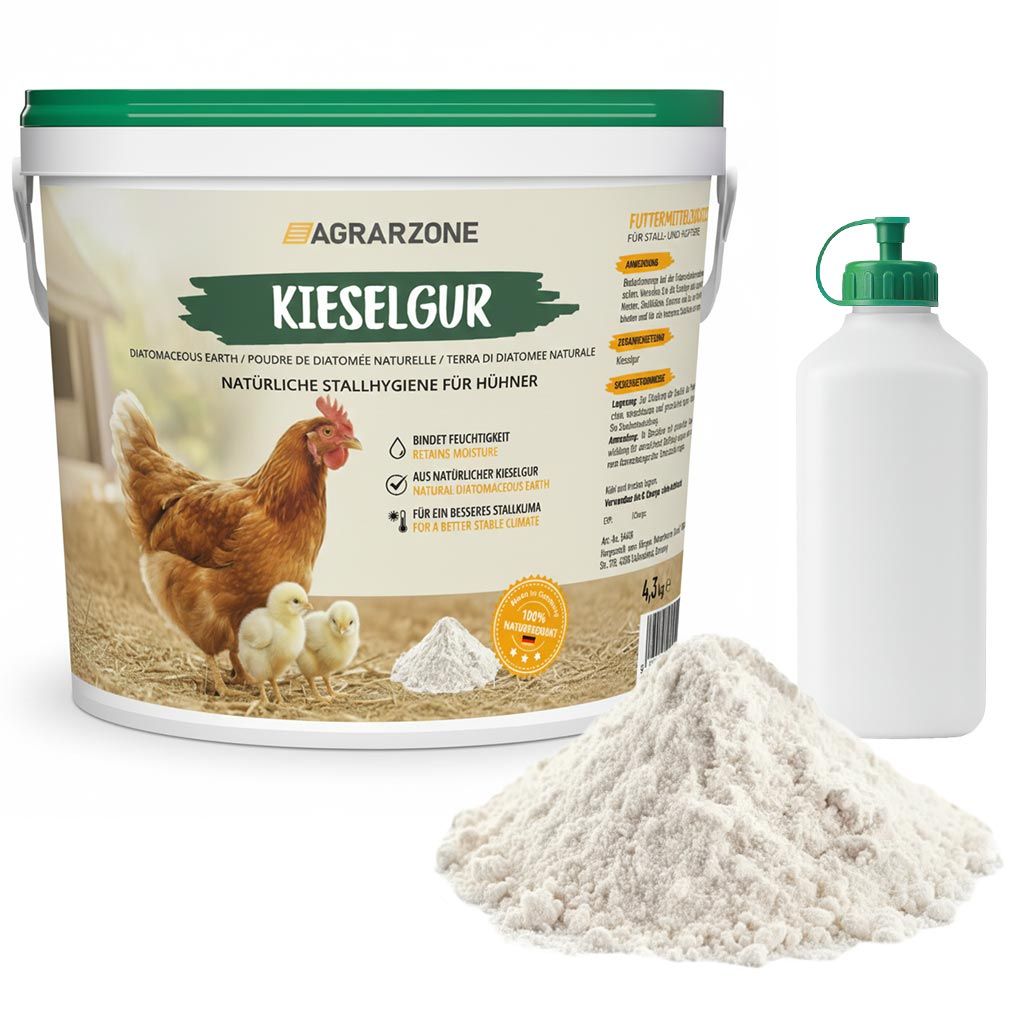 Prodotta in Germania con rigore e competenza, questa terra di diatomee (conosciuta anche come Kieselgur) è facile da usare. Può essere semplicemente distribuita sui nidi, sui pavimenti delle stalle e sulla lettiera o diluita in acqua per essere spruzzata. È importante assicurare una buona ventilazione durante l'uso o indossare un dispositivo di protezione delle vie respiratorie, se necessario.