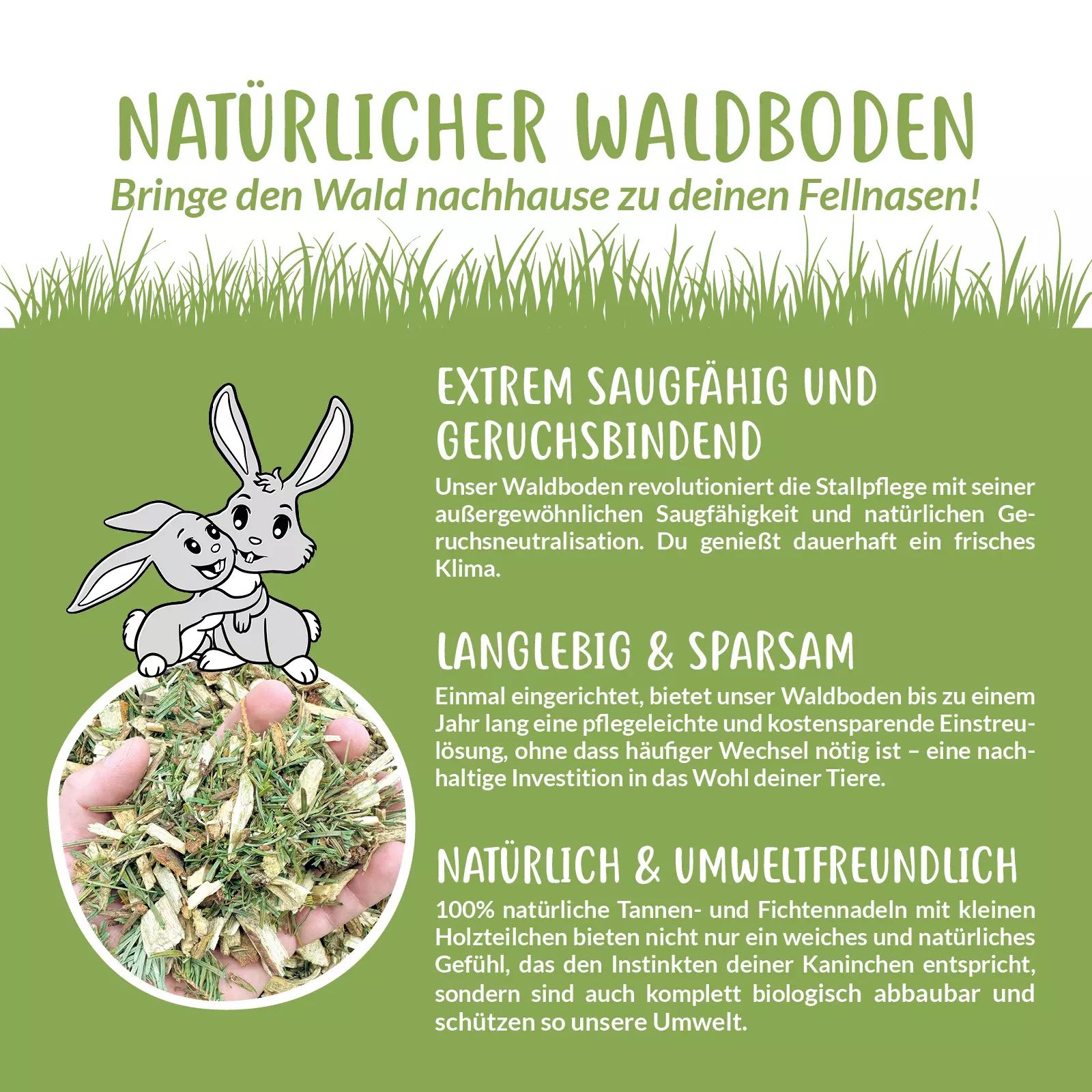 The Forest Floor bedding is suitable for rabbits, guinea pigs, chickens & horses. It offers particular advantages for horses: The almost dust-free structure is gentle on the respiratory tract. The natural, skin-friendly materials can reduce irritations and allergies. The bedding relieves the joints with its resilient layer and facilitates manure disposal thanks to its strong moisture binding.