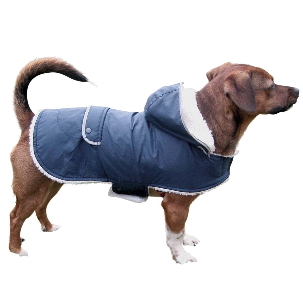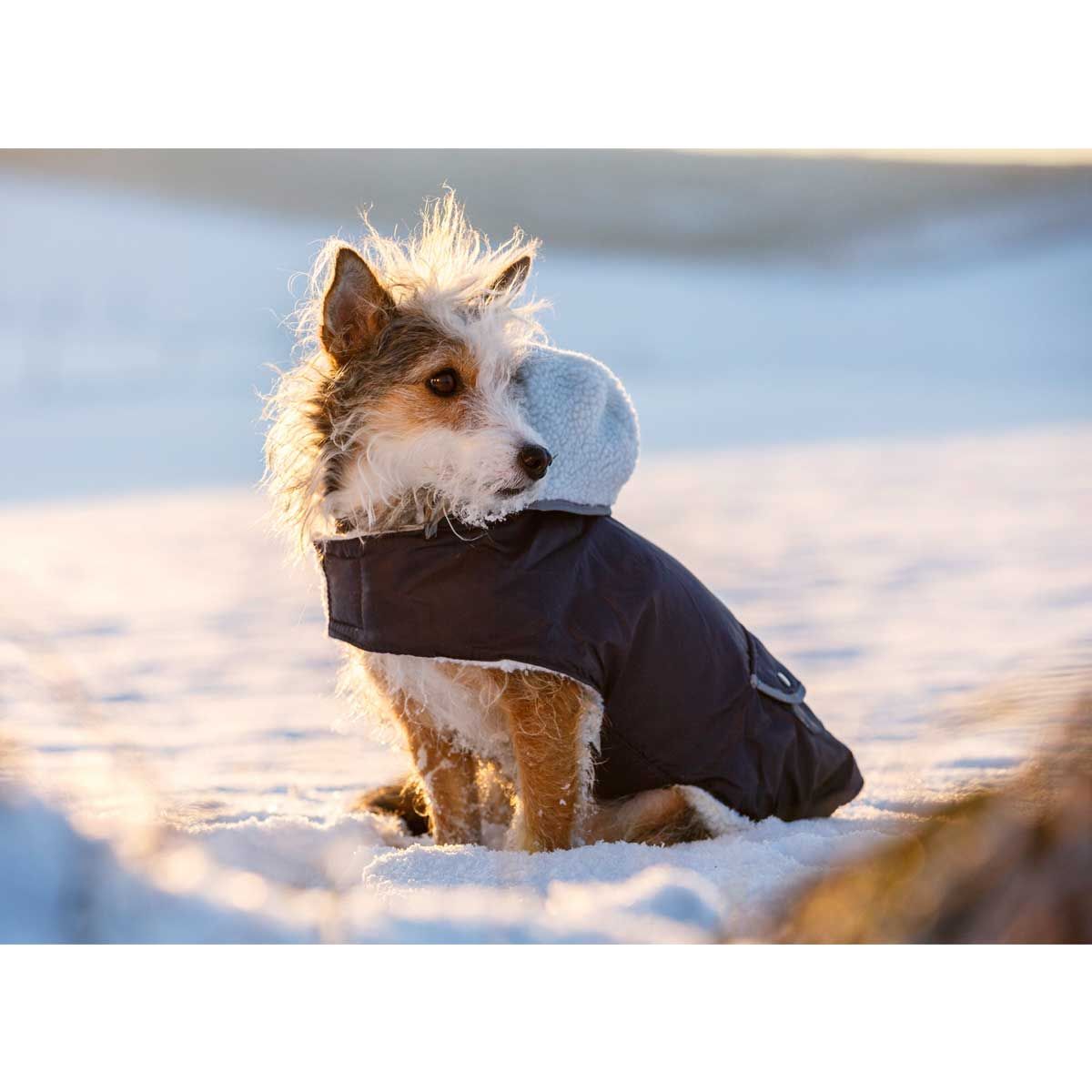 Se fuori non si sta bene, il cappotto di Cappotto per cani Teddy Protegge il vostro amico a quattro zampe. È idrorepellente e antivento e la fodera in orsetto mantiene il vostro animale domestico al caldo. La striscia riflettente sulla tasca posteriore offre una protezione ottimale al buio.