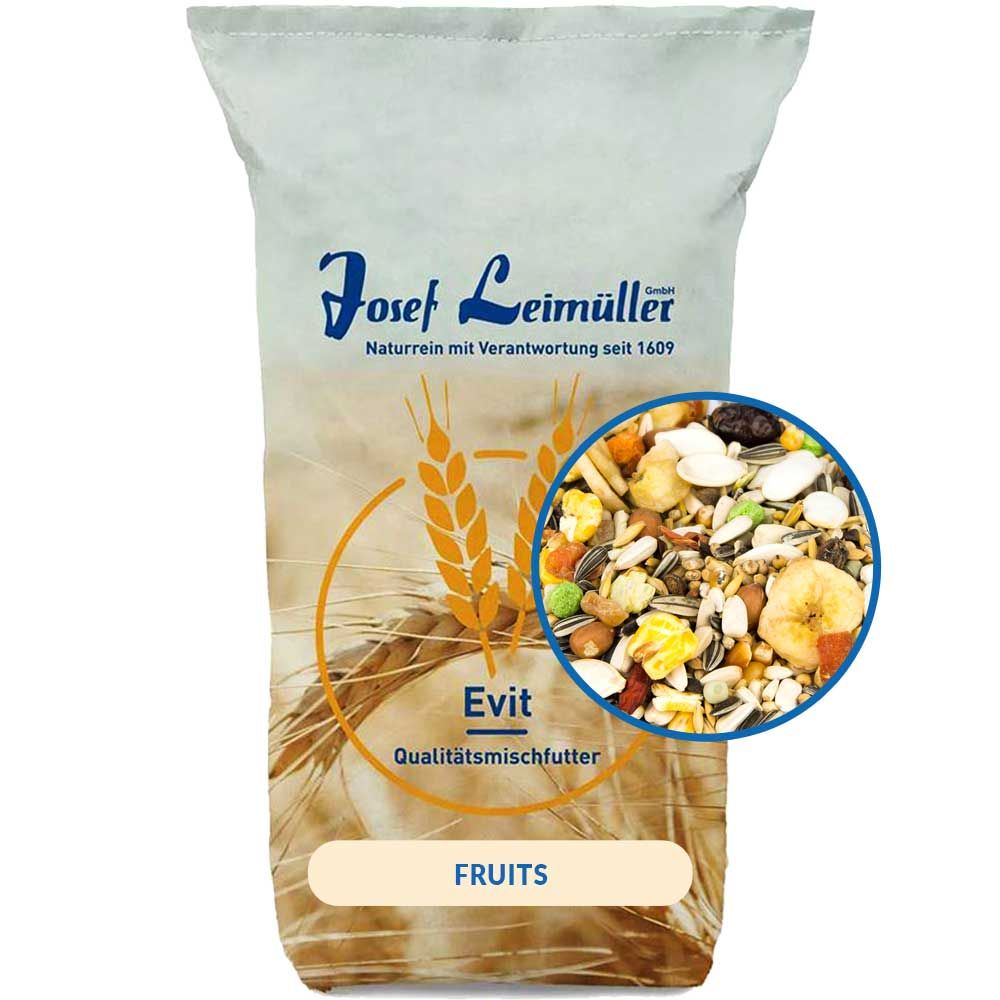 Conserva Leimüller Muesli per pappagalli con frutta disidratata in luogo pulito, al fresco e all'asciutto.