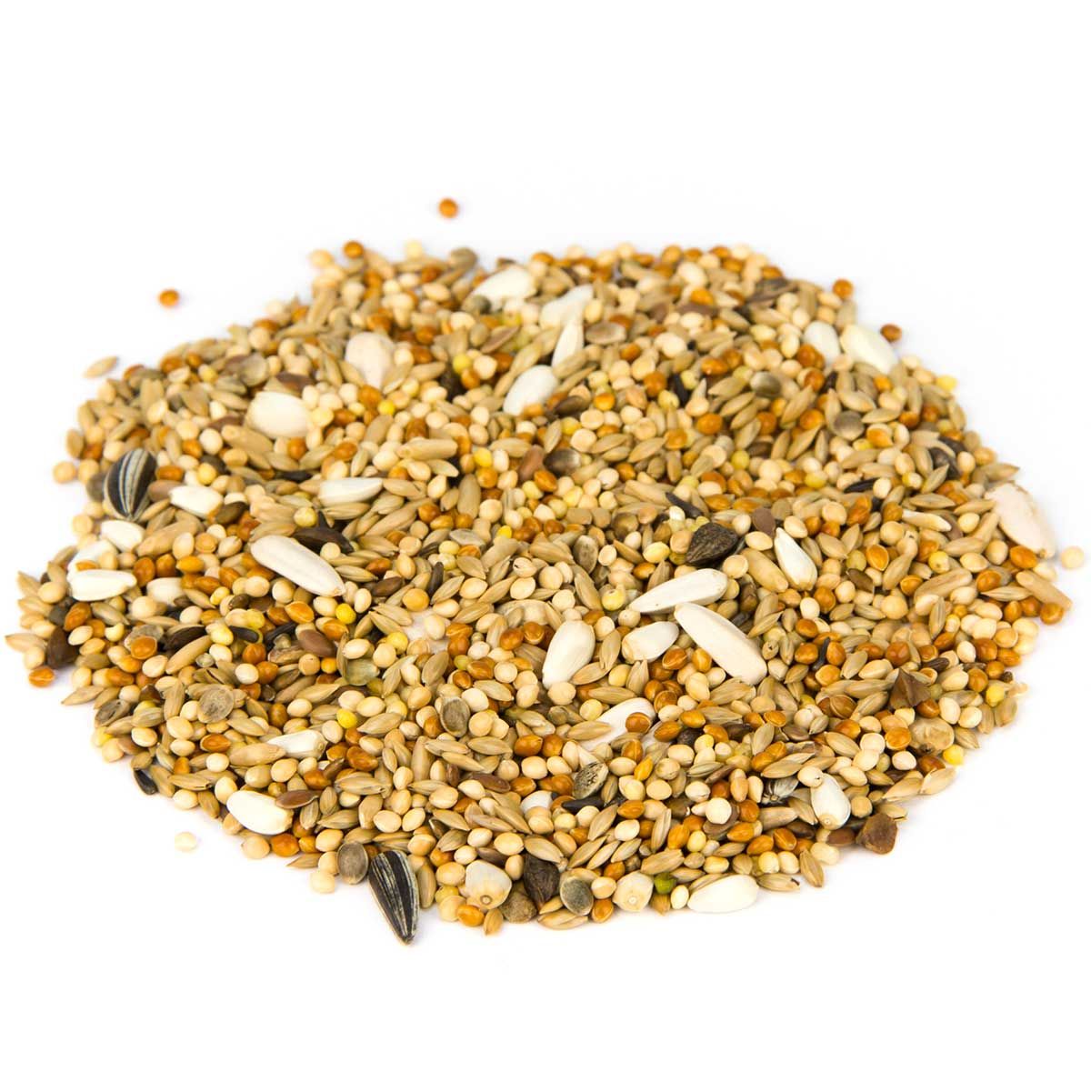 33,9% di miglio giallo, 32% di semi lucidi, 21% di miglio rosso, 4% di avena arrotolata, 3% di semi di cardi, 2% di semi di lino, 2% di canapa, 1% di semi di negro, 0,5% di grano saraceno, 0,3% di girasole striato, 0,3% di girasole bianco